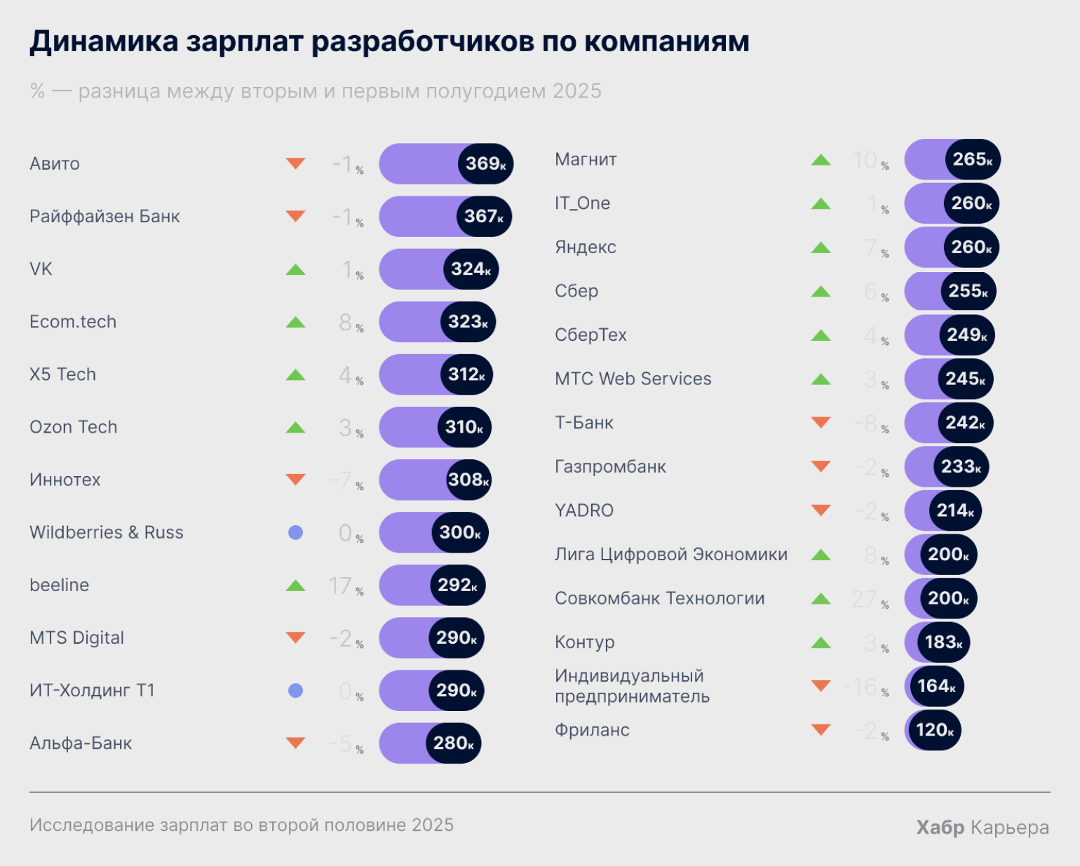 Снова обратимся к свежим данным «Хабр Карьеры» и увидим, что лидер по зарплатам IT-специалистов — компания «Авито» с медианой в 369 тысяч рублей. На втором месте — «Райффайзен Банк» с 367 тысячами рублей, а замыкает тройку VK с 324 тысячами рублей. То есть банковский сектор и крупные IT-корпорации предлагают одни из самых высоких окладов благодаря большим бюджетам, сложным задачам и строгим требованиям к надёжности систем.