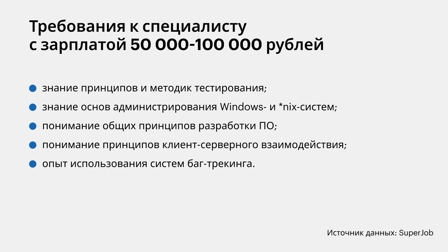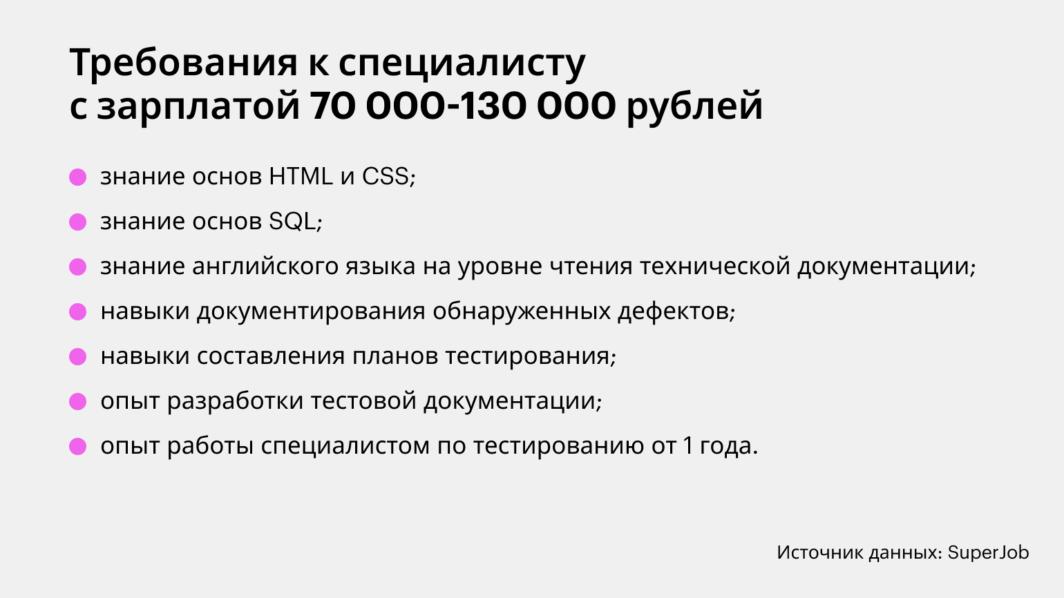 Согласно исследованию SuperJob, нижняя граница зарплат специалистов в тестировании — 50 тысяч рублей. Хотя бывает и меньше.