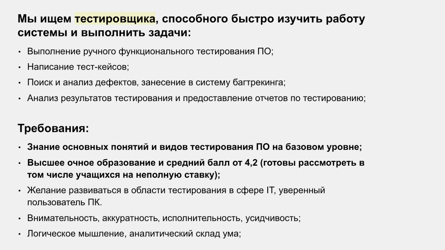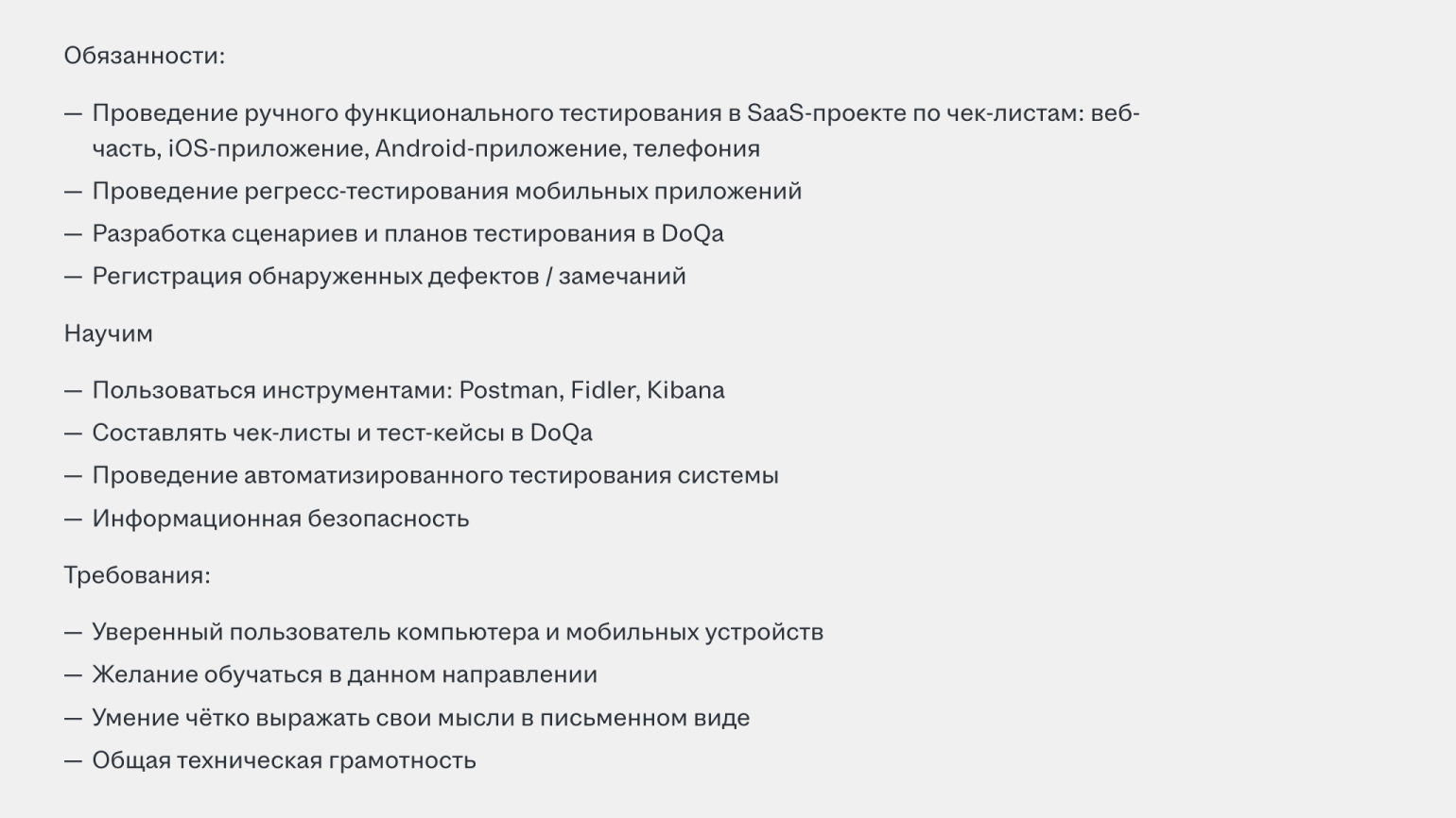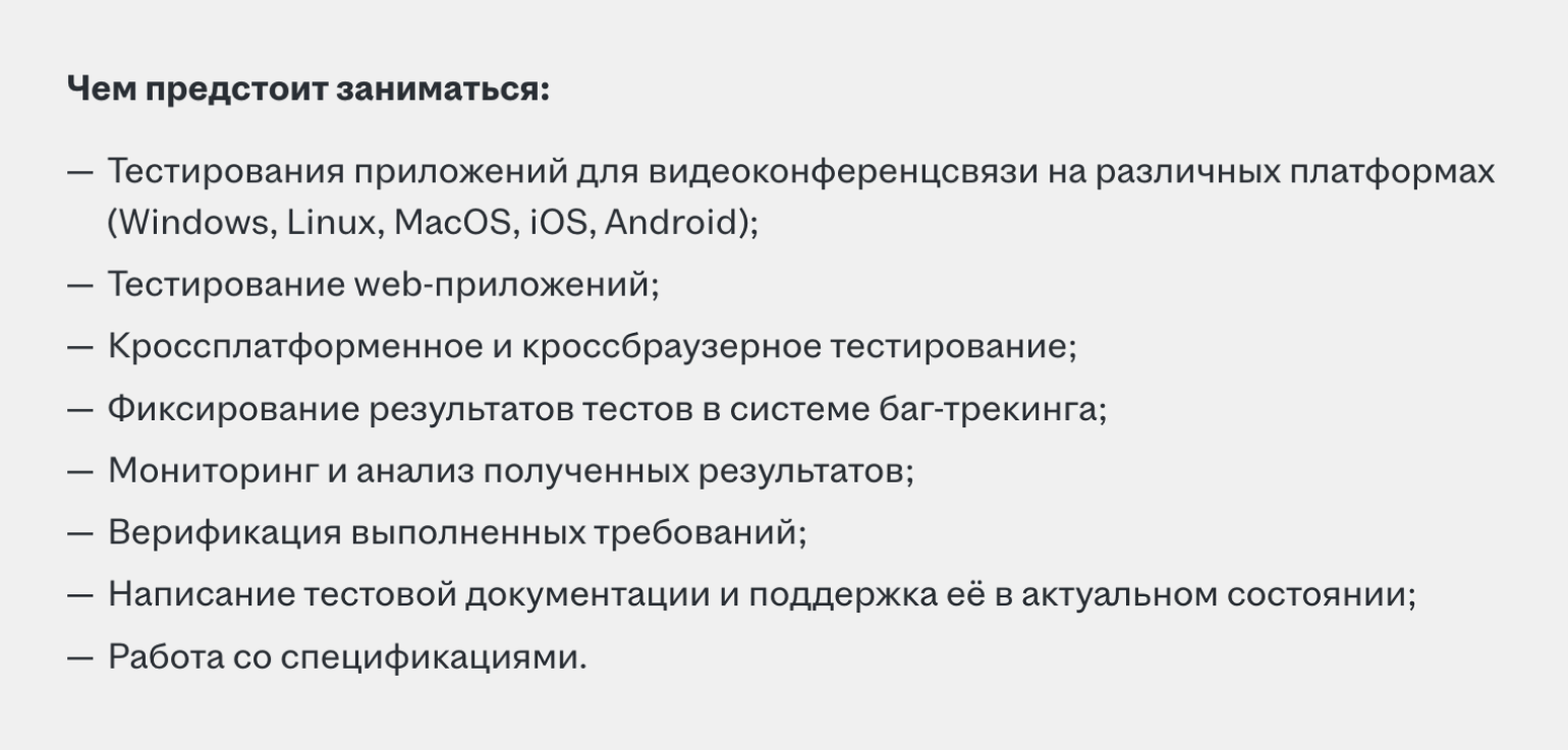 Стажёры, как обычно, получают меньше опытных коллег. Например, в Москве стажёру-QA предлагают до 25 тысяч рублей на руки. Среди требований — знание основ тестирования и стандартный набор обязанностей для тестировщиков.