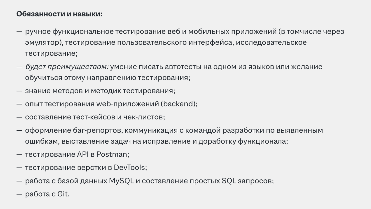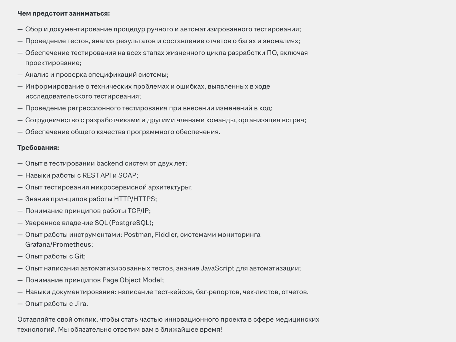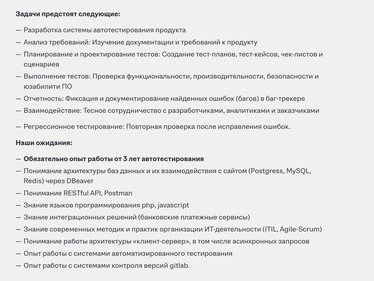 Для другой вакансии с зарплатой от 60 тысяч рублей необходимо владеть SQL, Postman и системами мониторинга Grafana и Prometheus. От начинающего специалиста также требуют опыт написания автоматизированных тестов на JavaScript.