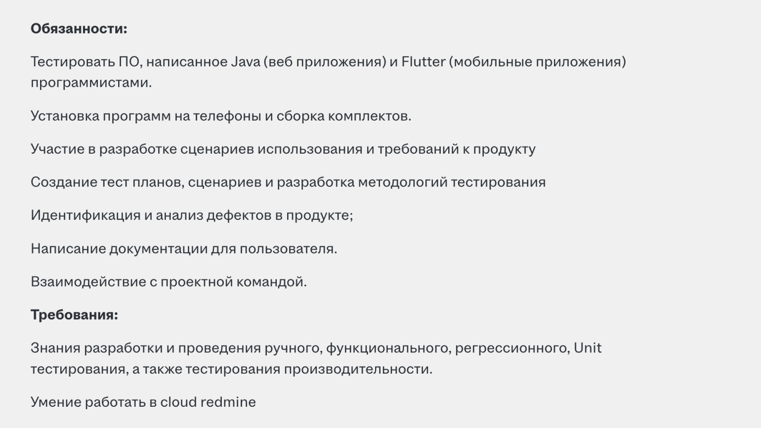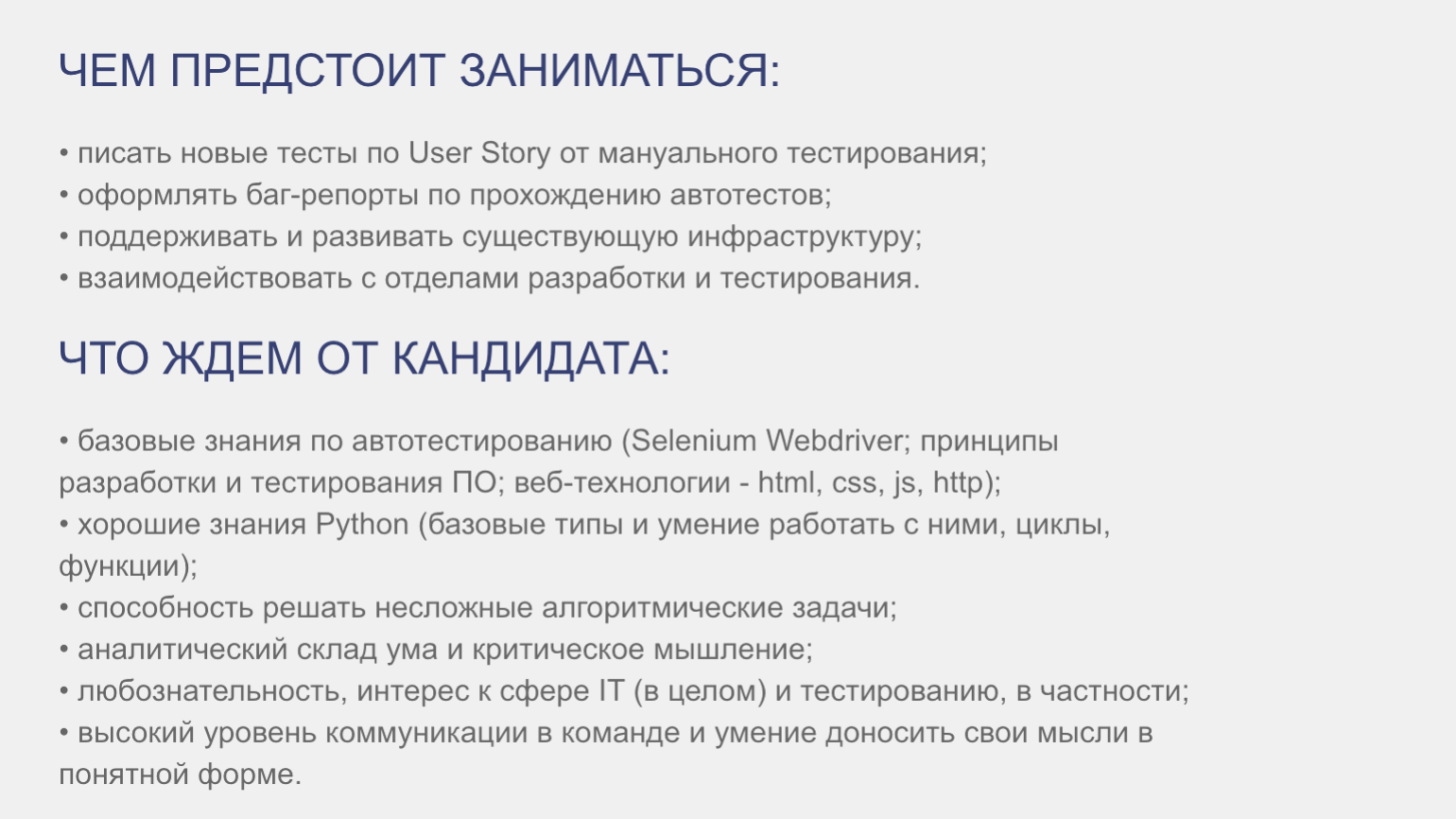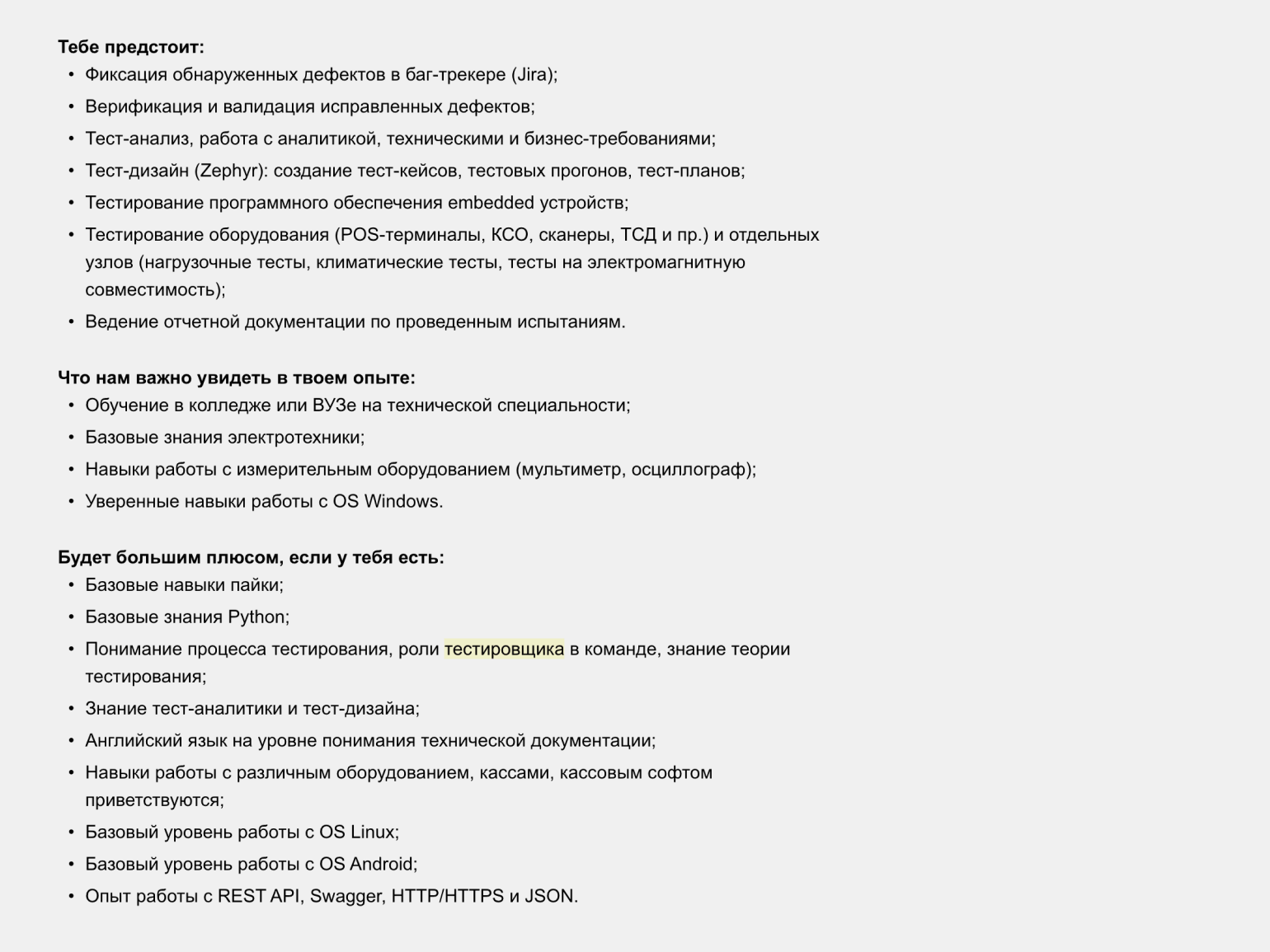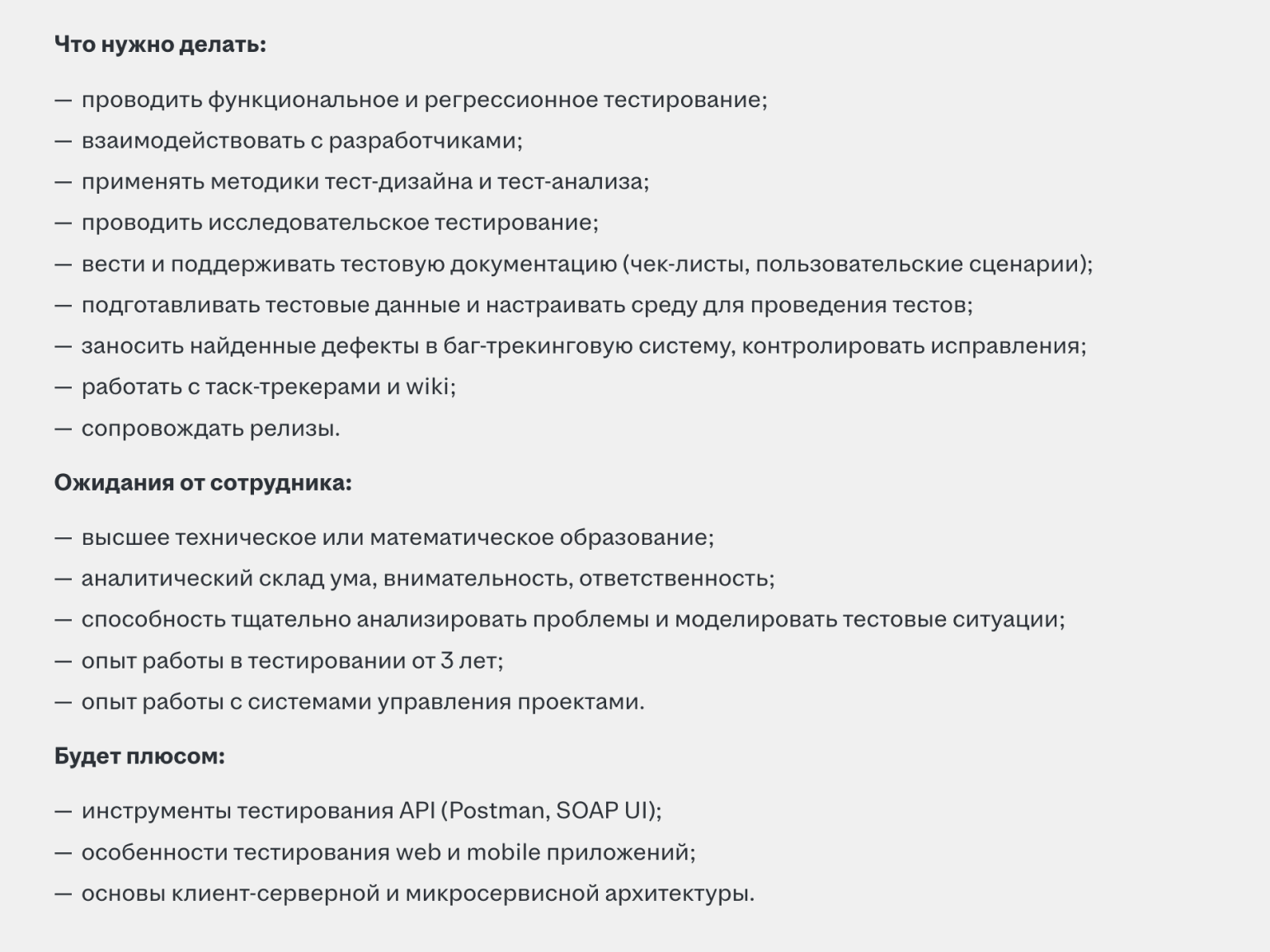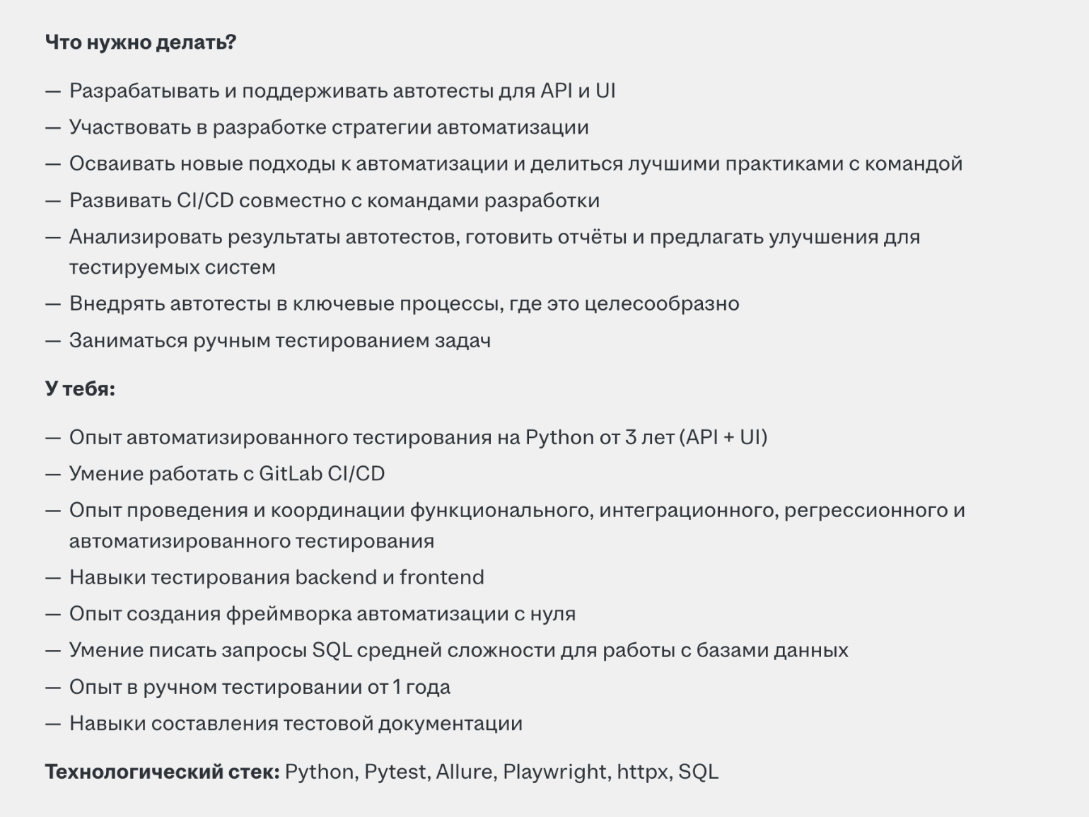 А вот вакансия, в которой ждут тестировщика с умением писать автотесты на Python и желанием работать за 40–50 тысяч рублей в месяц.