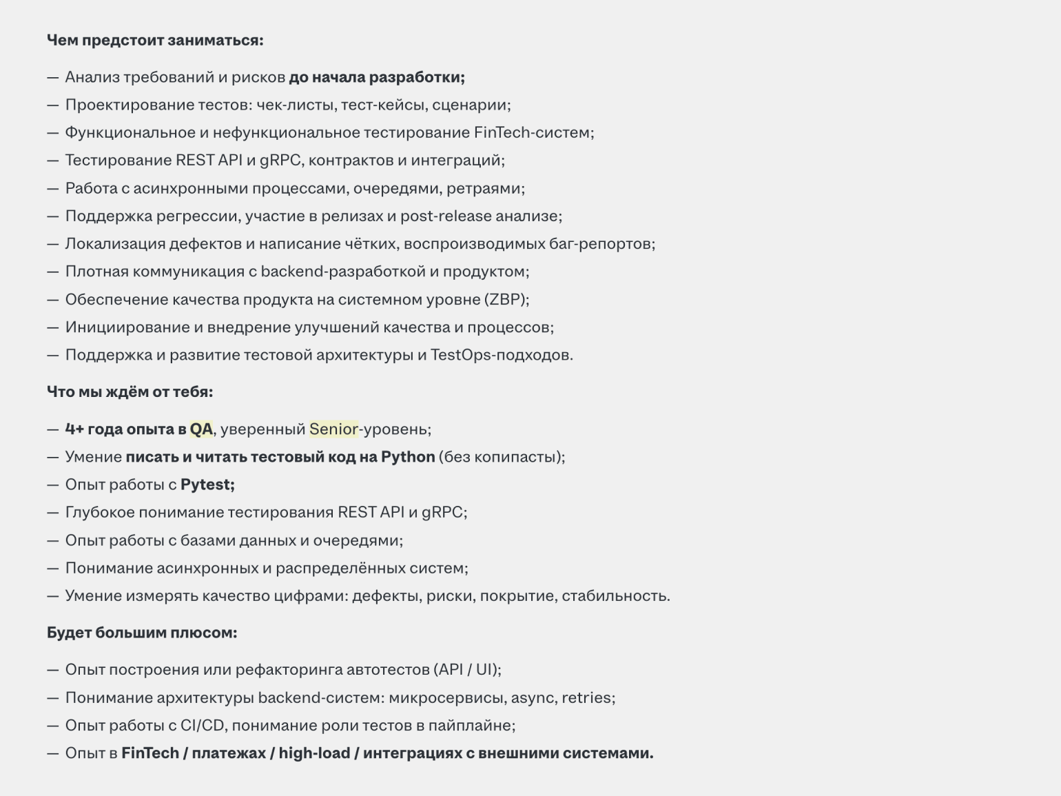 Специалист уровня senior может претендовать на зарплату от 200 до 300 тысяч рублей в месяц. Ему предстоит писать автотесты на Python, проводить функциональное тестирование, поддерживать и развивать тестовую архитектуру и подходы в компании.