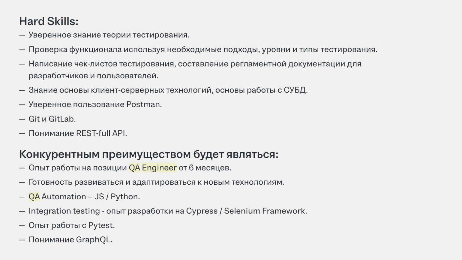 Разберитесь, что именно должен уметь джуниор-тестировщик или QA-инженер. Для этого вы можете изучить список требований, который мы собрали выше, или самостоятельно проанализировать актуальные вакансии.