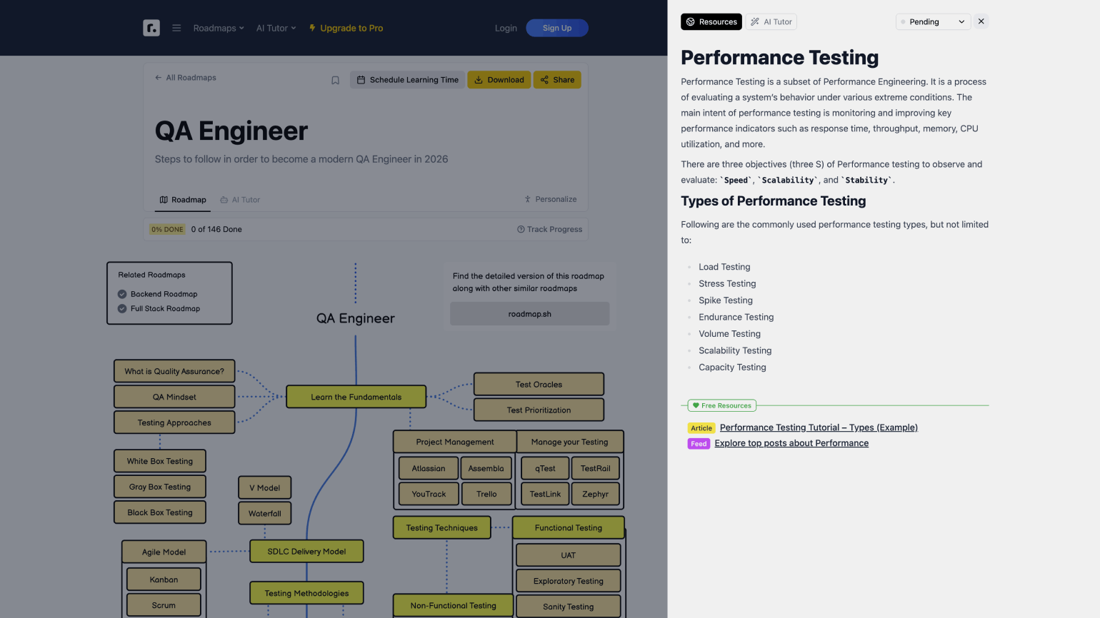 Если не знаете какой ресурс выбрать по конкретной теме, попробуйте roadmap.sh — это карта компетенций для QA-инженера. При клике на любой блок сайт предложит бесплатные ресурсы по теме — статью, видеоурок или даже небольшой курс.