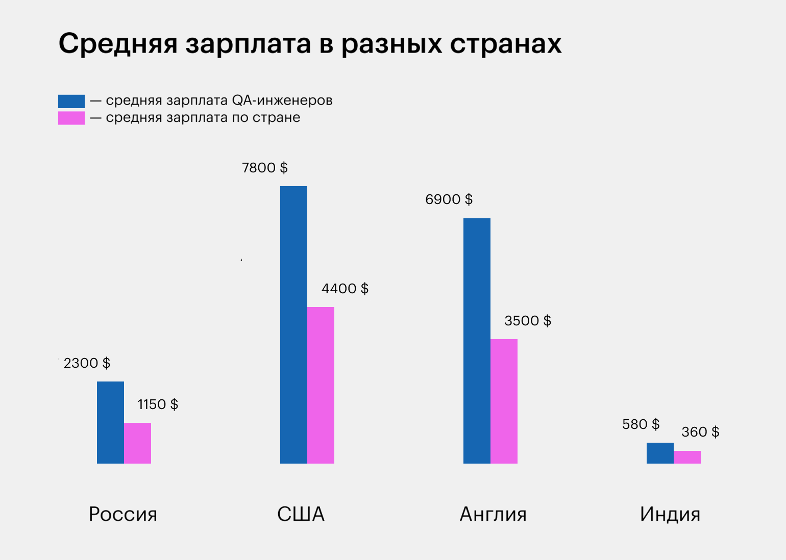 Во многих странах средняя зарплата специалистов по тестированию больше, чем средняя зарплата по стране. Для наглядности мы сравнили зарплаты в России, США, Великобритании и Индии.