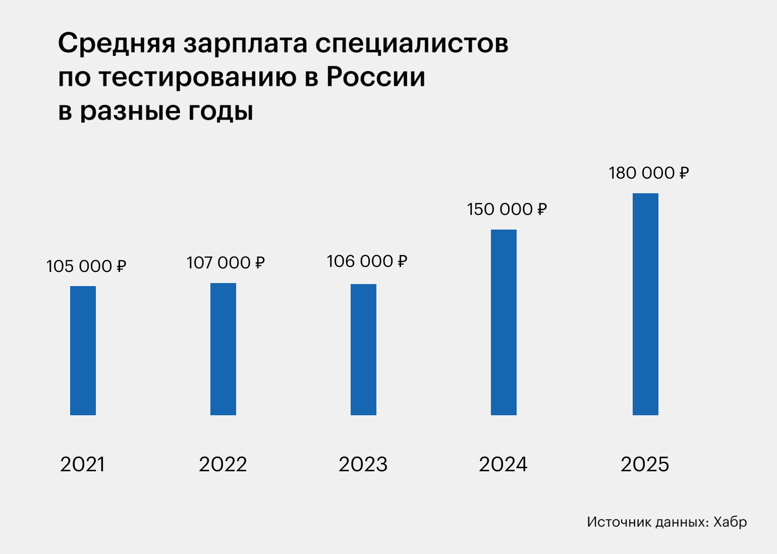 Такие зарплаты, конечно, были не всегда. По данным исследования «Хабра», в 2024 году средняя зарплата специалистов в тестировании ПО в России составляла 150 000 рублей, а в 2023 году — 106 000 рублей.
