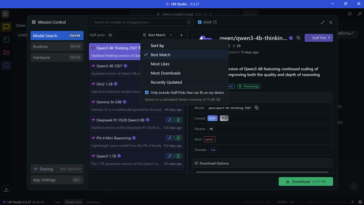 После установки запустите LM Studio, выберите значок поиска на левой боковой панели и посмотрите список доступных нейросетей. В этом разделе вы можете отфильтровать модели по популярности, количеству скачиваний и другим параметрам. Также вы можете поставить галочку возле надписи «Only include Staff Picks that can fit on my device», чтобы видеть только те модели, что совместимы с вашим устройством.
