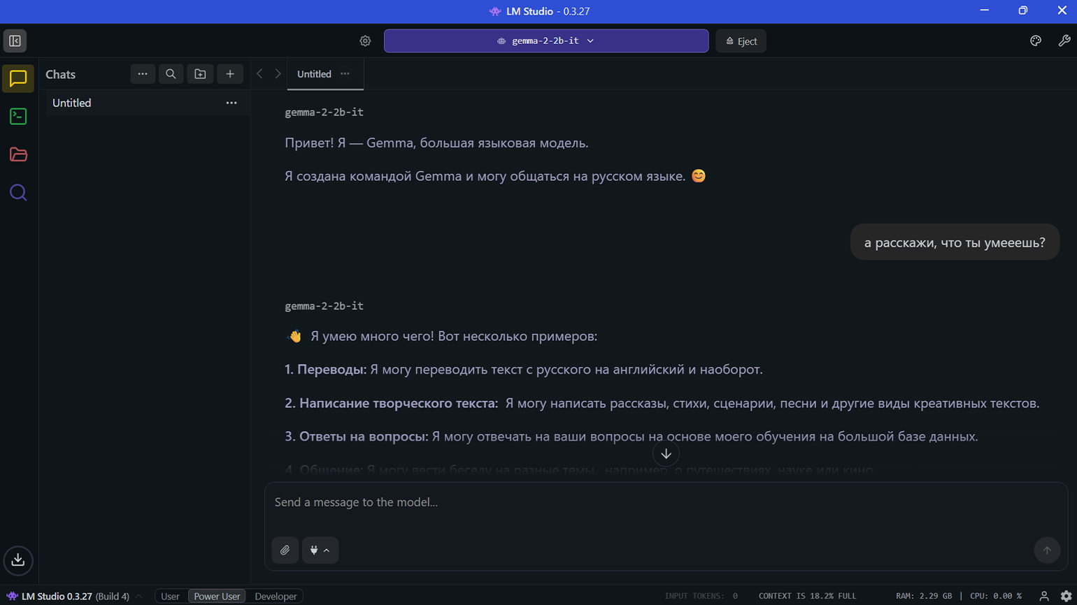 Мы загрузили встроенную Gemma 3:4b и попросили нейросеть рассказать о себе — модель написала, что умеет работать с разными форматами контента на русском. Например, готова писать нам стихи.