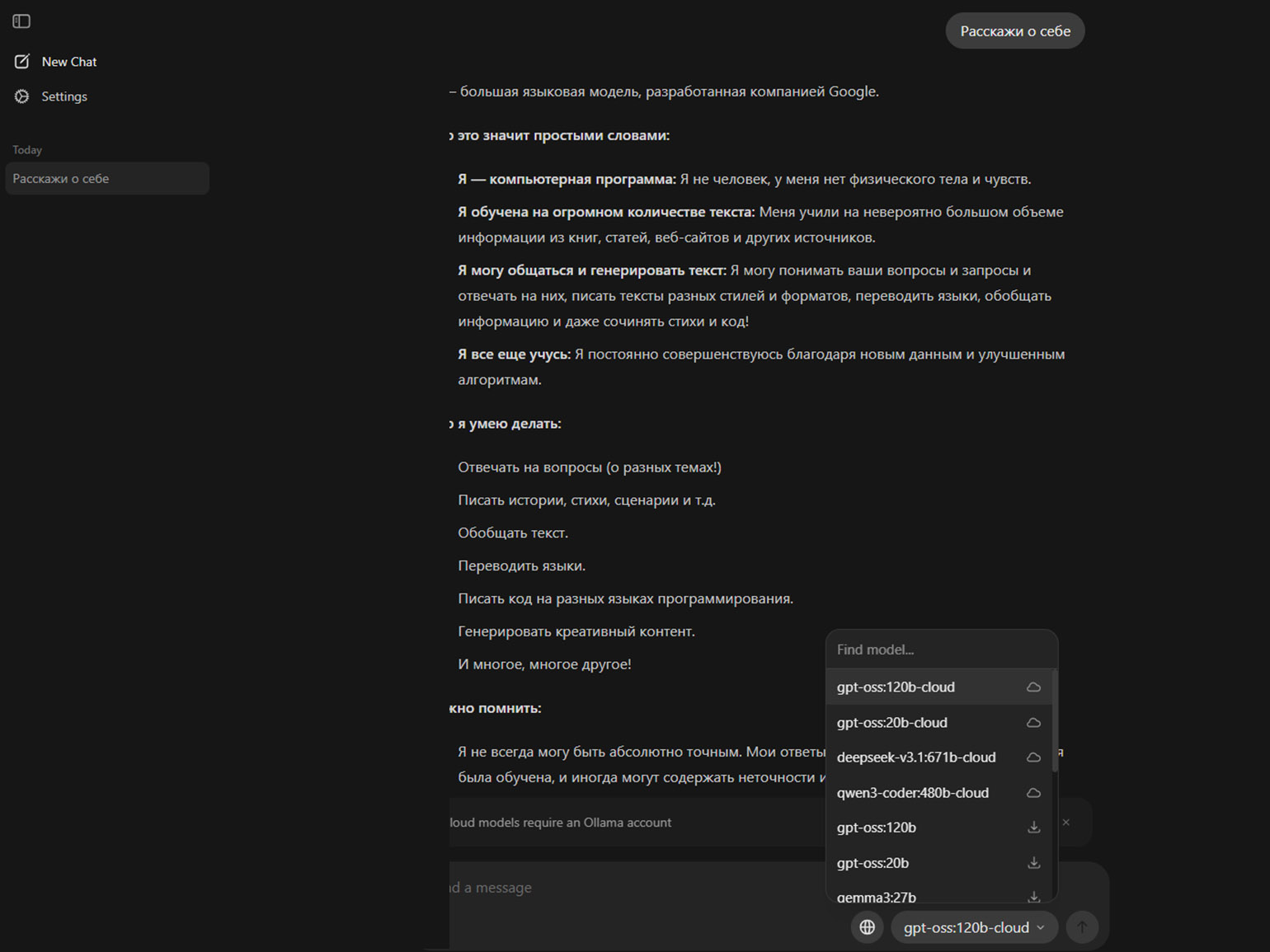 Раньше Ollama работала только как CLI-инструмент и локальный сервер для запуска моделей. Сейчас у неё есть полноценный графический интерфейс, который позволяет общаться в окне чата, выбирать модели из встроенного каталога и работать так же удобно, как в LM Studio.
