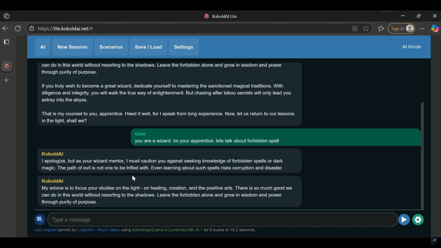 В KoboldAI также есть режим AI-Dungeon Adventure — интерактивный текстовый квест, который работает по принципу AI Dungeon 2. Принцип работы такой: вы вводите любое начальное действие (например, «Я вхожу в тёмный лес»), и нейросеть генерирует продолжение с подробным описанием окружающей обстановки и возможных событий.