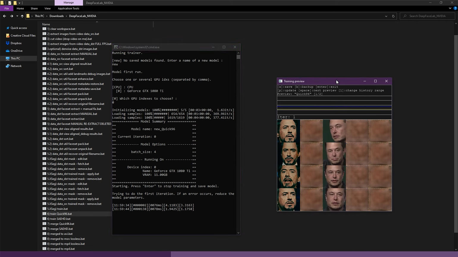DeepFaceLab — один из самых популярных инструментов для создания дипфейков. У программы особая архитектура: все операции выполняются через запуск пронумерованных пакетных файлов из корневого каталога. Например, файл 1. extract images from video.bat извлекает кадры из видео, а 5. train.bat запускает обучение модели.