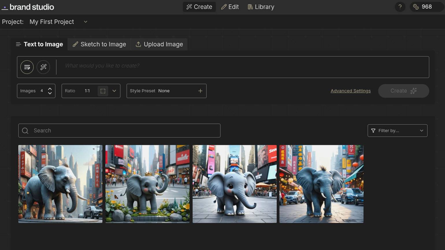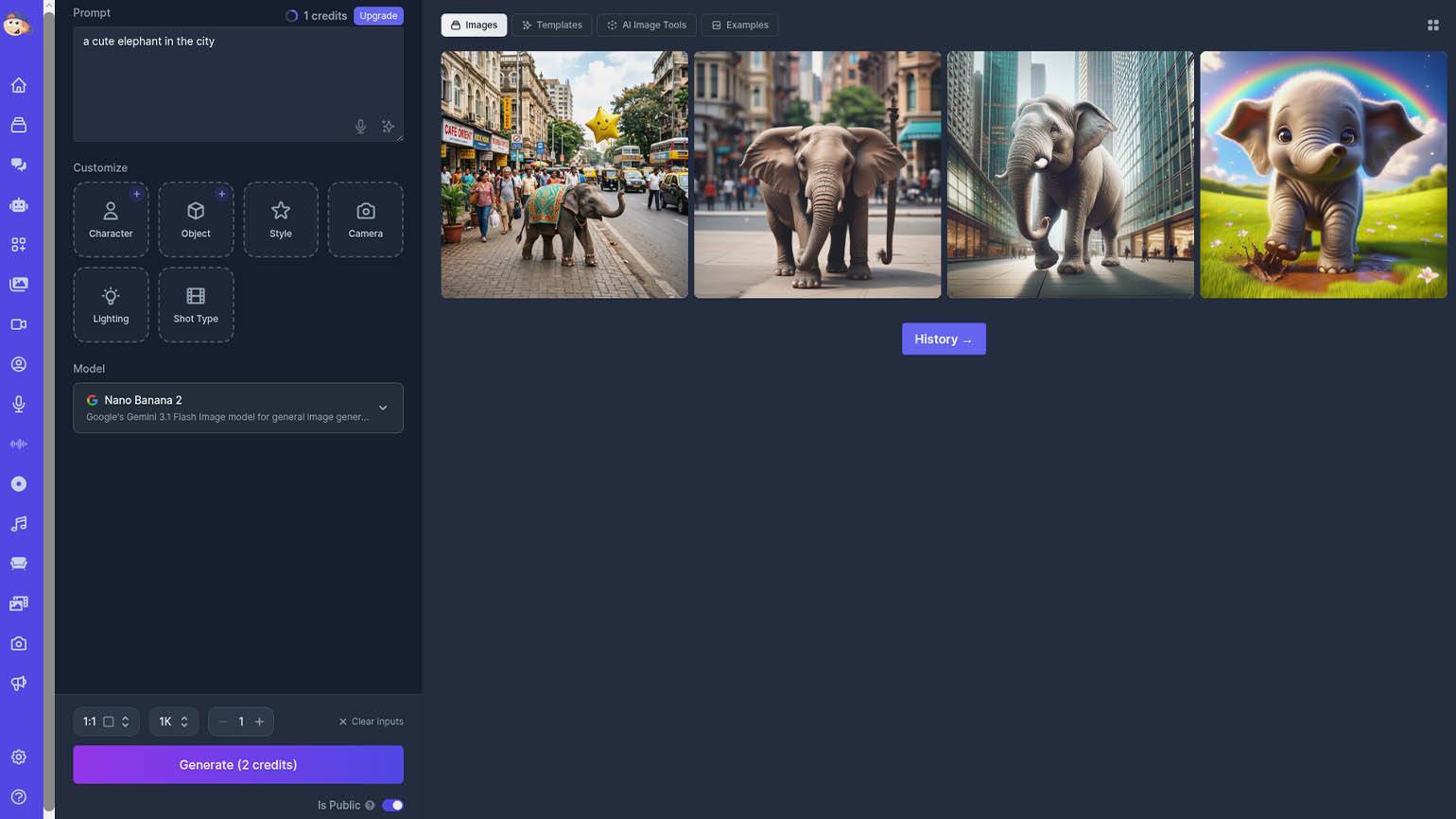 Krea AI — платформа‑агрегатор, которая объединяет популярные ИИ‑модели для создания и редактирования изображений, видео и 3D‑объектов. Сервис работает в браузере и рассчитан на англоязычную аудиторию, поэтому для более точных результатов промпты лучше переводить с русского на английский. В нашем случае запрос будет таким: «A cute elephant in the city».
