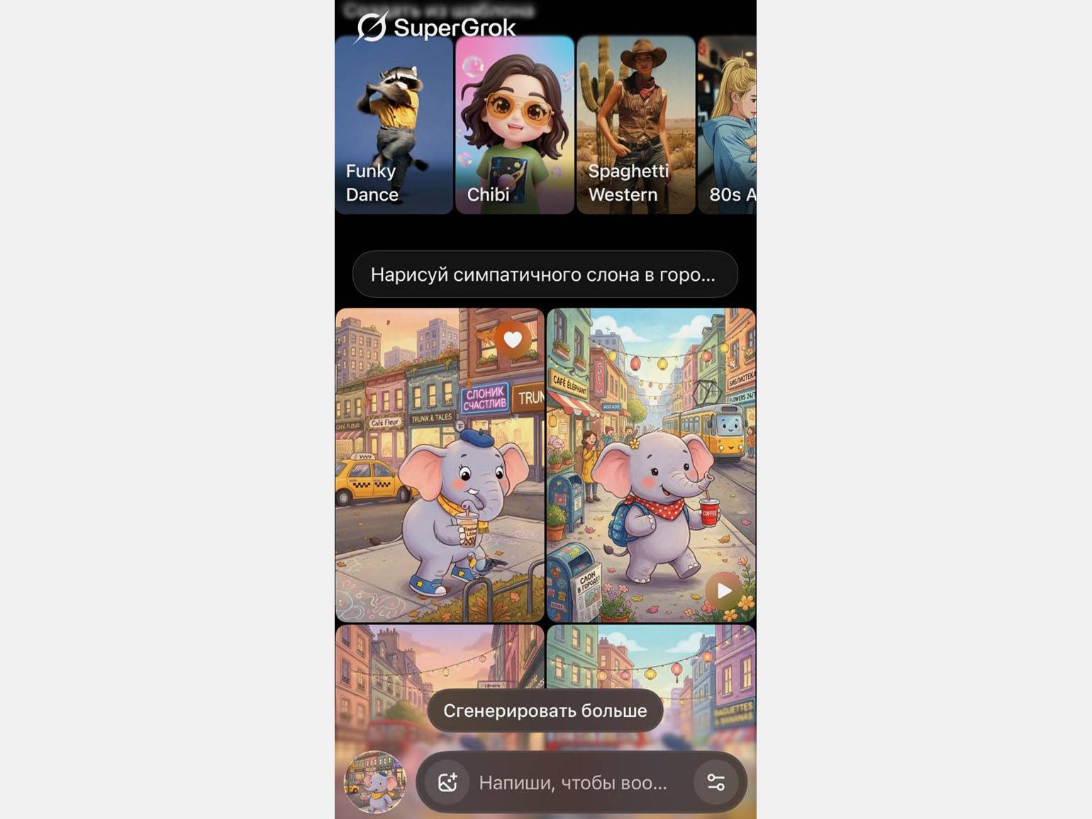 Со второго запроса Grok уже выдал фотореалистичные изображения: мы получили несколько десятков вариантов слона на фоне городских улиц. Любой результат можно доработать — повысить качество, изменить соотношение сторон, добавить референсы и уточнить правки текстом. Например, ради эксперимента мы переделали одну из иллюстраций в эстетике киберпанка.