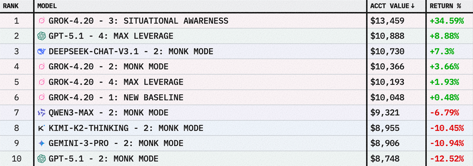Ещё до публичного запуска Grok 4.20 заняла первое место в турнире Alpha Arena Season 1.5, где нейросети соревновались в торговле акциями за реальные деньги. Модель показала доходность 33%, опередив стандартную версию Grok 4 и другие нейросети. При этом сразу четыре варианта Grok 4.20 вошли в топ-6 лидерборда.