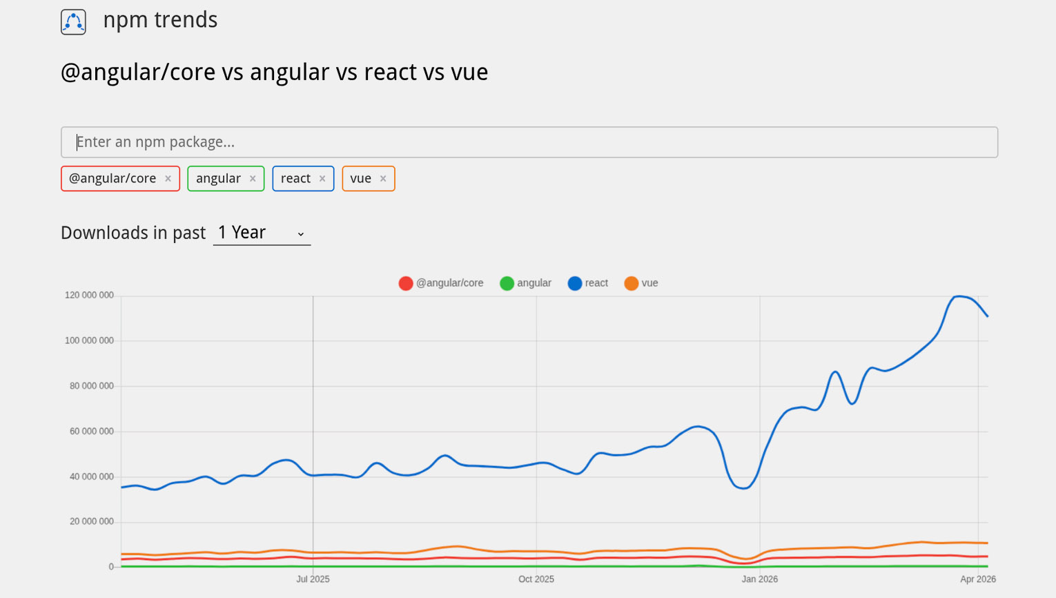 Один из популярных фреймворков: Angular, Vue.js или React. Есть ещё Ember, Svelte, Backbone.js и другие, но нам в джуниорских вакансиях они ни разу не встретились. Статистика говорит, что React популярнее: его скачивают почти в пять раз чаще.