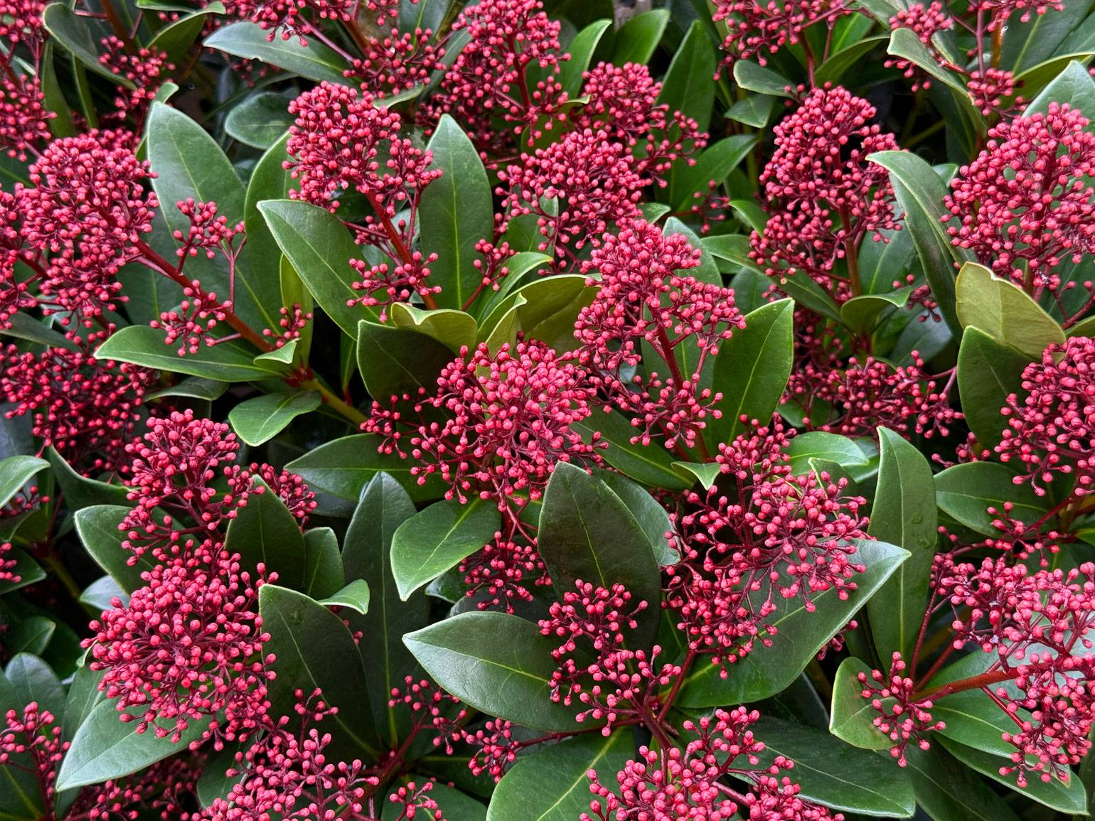 Скиммия — вечнозелёный кустарник, который особенно хорошо приживается в тенистых участках. У неё плотные тёмно-зелёные листья, весной появляются ароматные соцветия, а осенью и зимой — яркие ягоды.