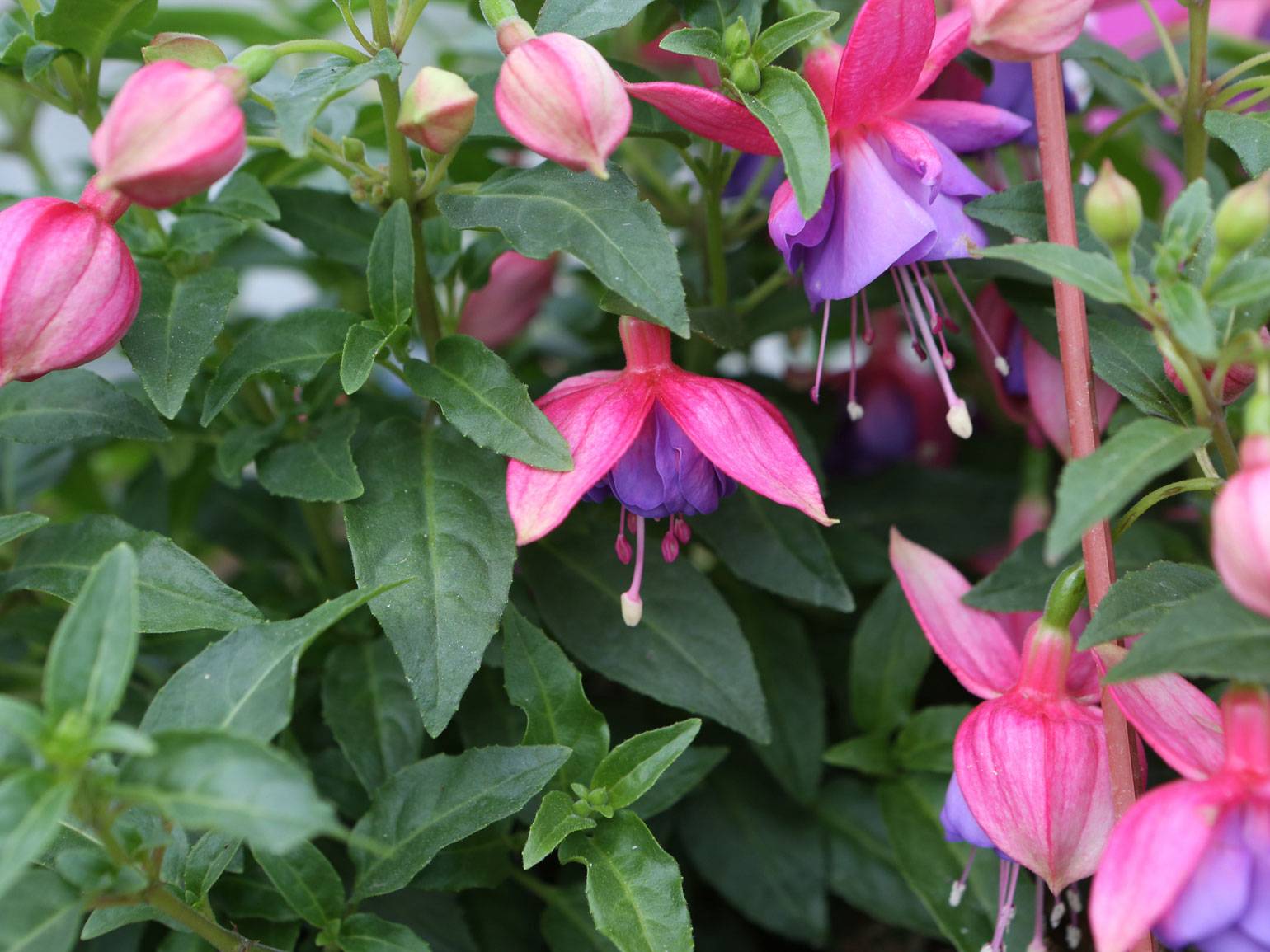 Фуксия — растение, которое чаще всего сажают туда, где солнце бывает только утром или вечером. У неё аккуратные зелёные листья и необычные поникающие цветки, из-за которых фуксию легко узнать: они свисают вниз, словно маленькие фонарики. Цветки бывают розово-фиолетовыми, красными, белыми или двухцветными. Цветёт фуксия долго — с начала лета и почти до осени.