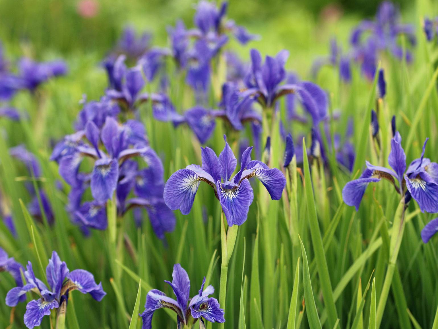 Ирисы, особенно сибирские и болотные сорта, хорошо подходят для участков с рассеянным светом. Растение представляет собой плотные кусты с узкими листьями насыщенного зелёного цвета, которые сохраняют декоративность с весны до осени. Цветки крупные, изящные, чаще всего в сине-фиолетовой, белой или жёлтой гамме. Цветение приходится на май — июнь.