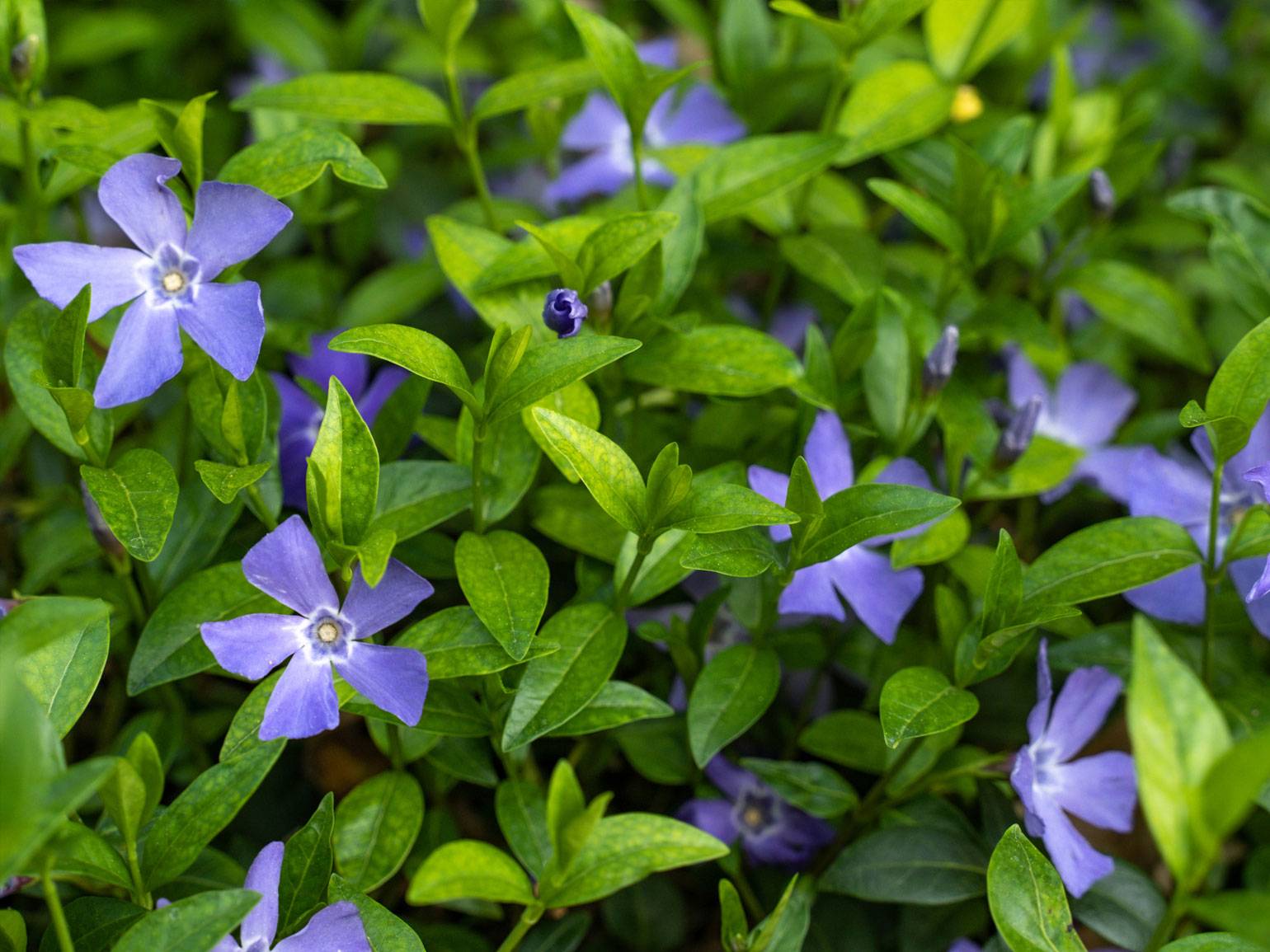 Барвинок — вечнозелёное почвопокровное растение, которое идеально подходит для тенистых участков. Его стелющиеся побеги быстро укореняются и образуют плотный зелёный ковёр — это точно нужно использовать для создания красивого «фона» в саду. Цветки небольшие, но выразительные, чаще всего синие или фиолетовые. Барвинок цветёт весной, иногда повторно летом.