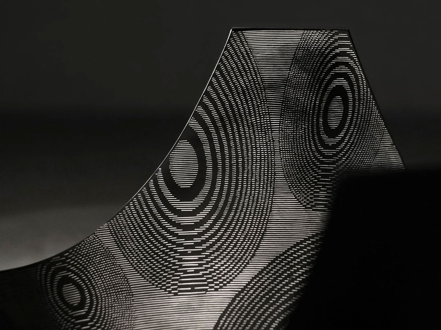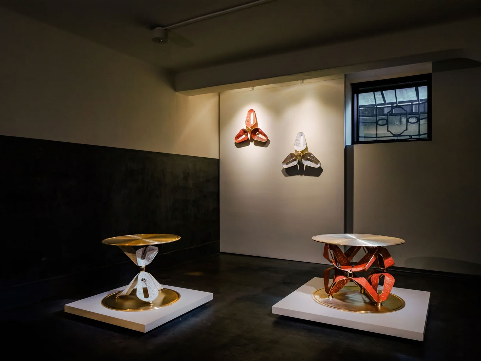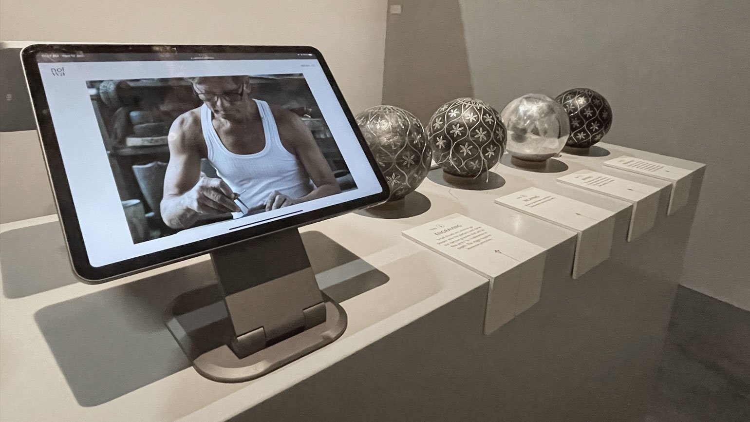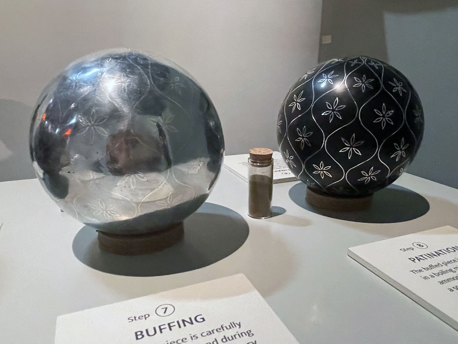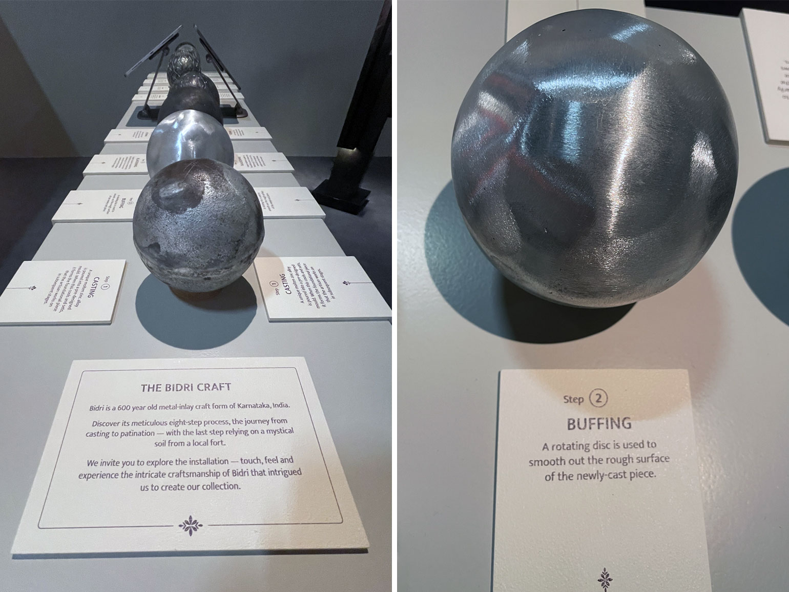 Трудоёмкий процесс работы поэтапно продемонстрировали на серии металлических шаров. Вокруг них располагались современные по форме предметы интерьера из чёрного матового металла с тонким геометрическим серебряным или золотым декором: например, журнальный столик «Капля» с оптическим рисунком из кругов, расходящихся по воде, большая настенная лампа «Горизонт».