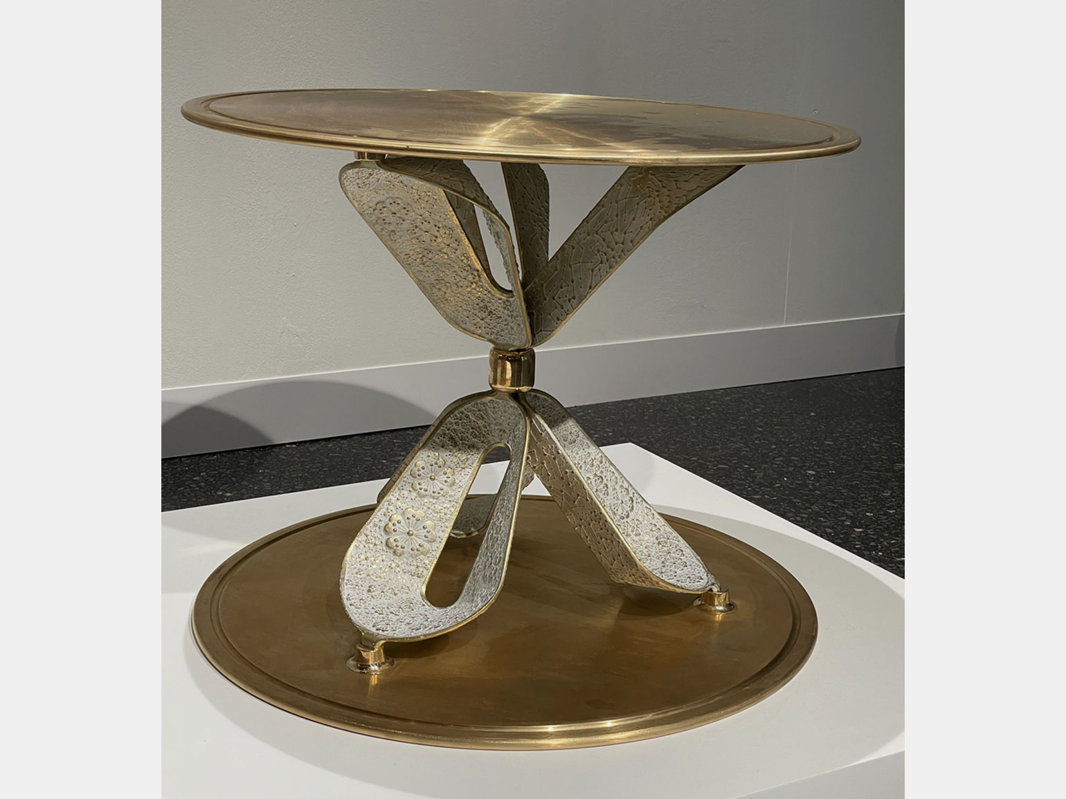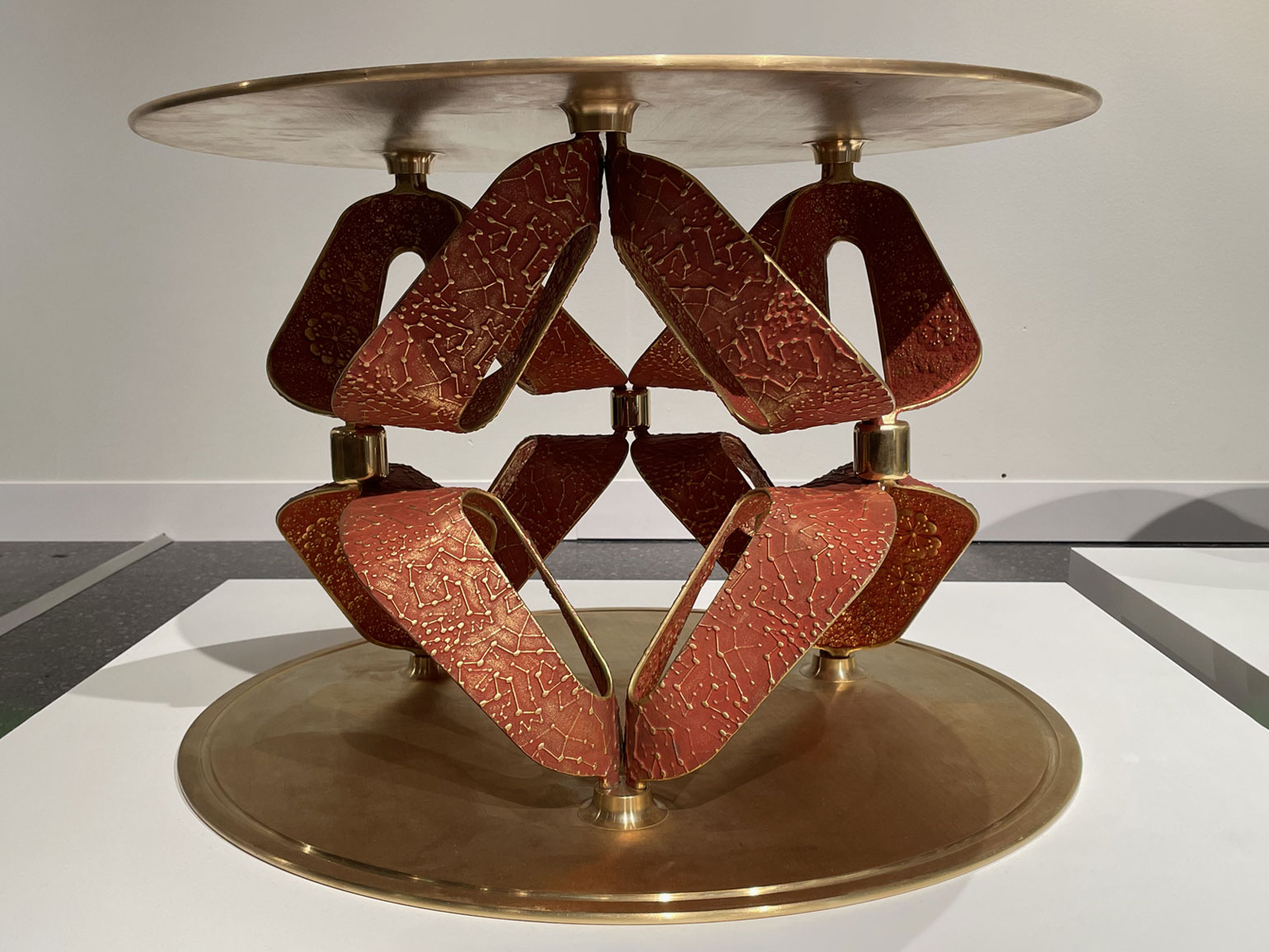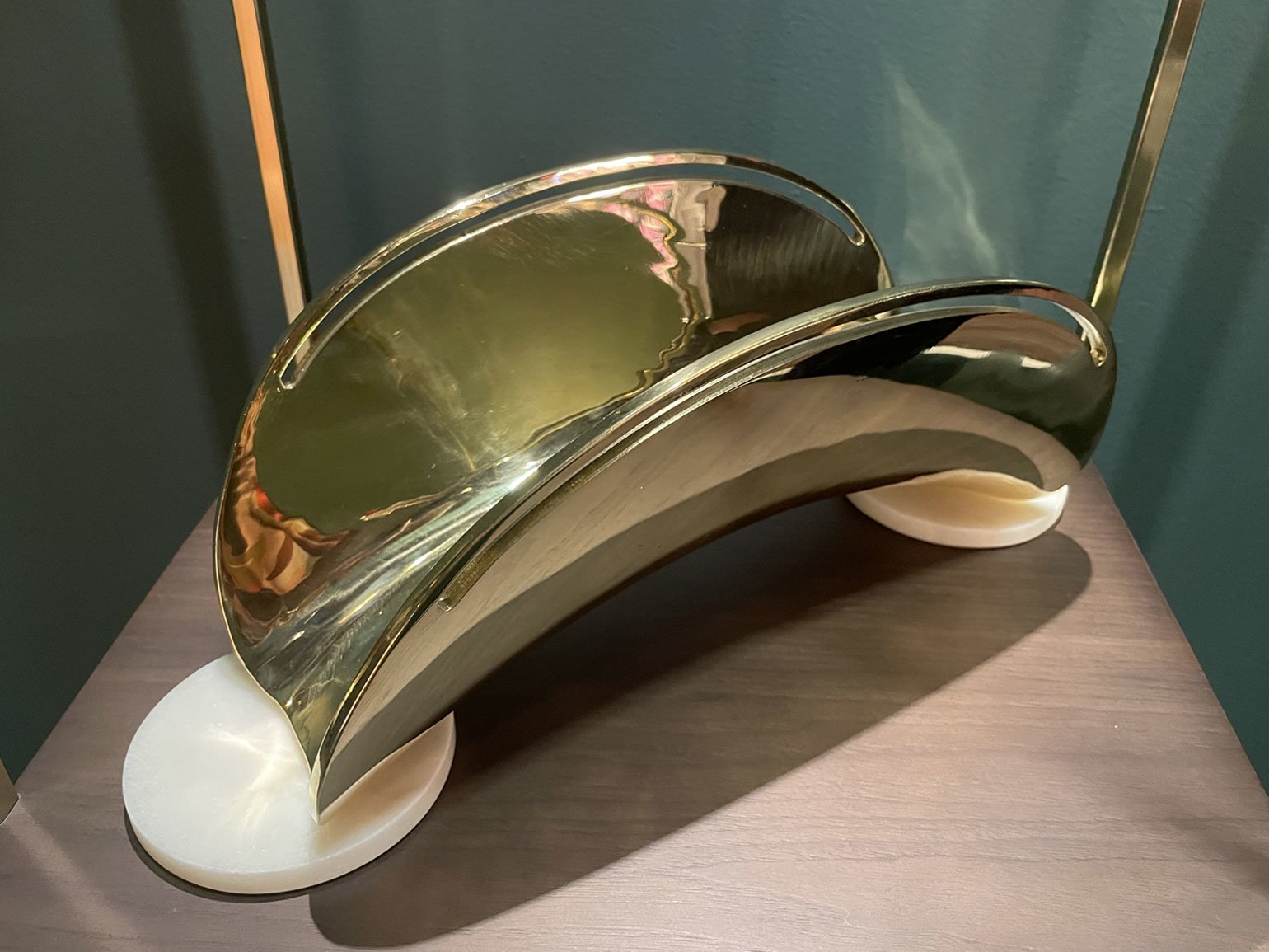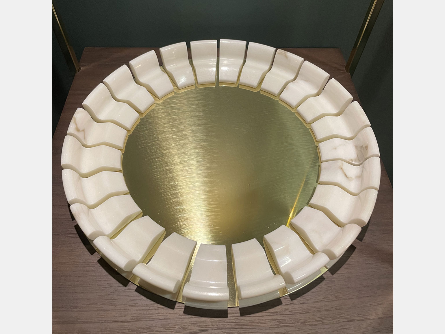 Трудоёмкий процесс работы поэтапно продемонстрировали на серии металлических шаров. Вокруг них располагались современные по форме предметы интерьера из чёрного матового металла с тонким геометрическим серебряным или золотым декором: например, журнальный столик «Капля» с оптическим рисунком из кругов, расходящихся по воде, большая настенная лампа «Горизонт».