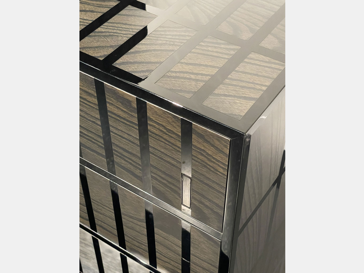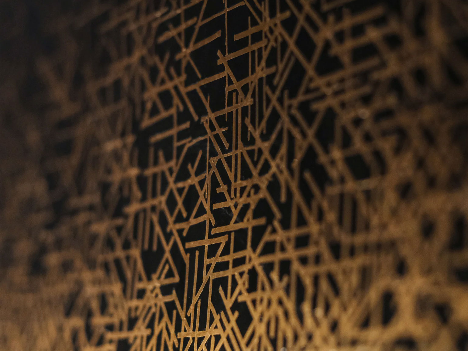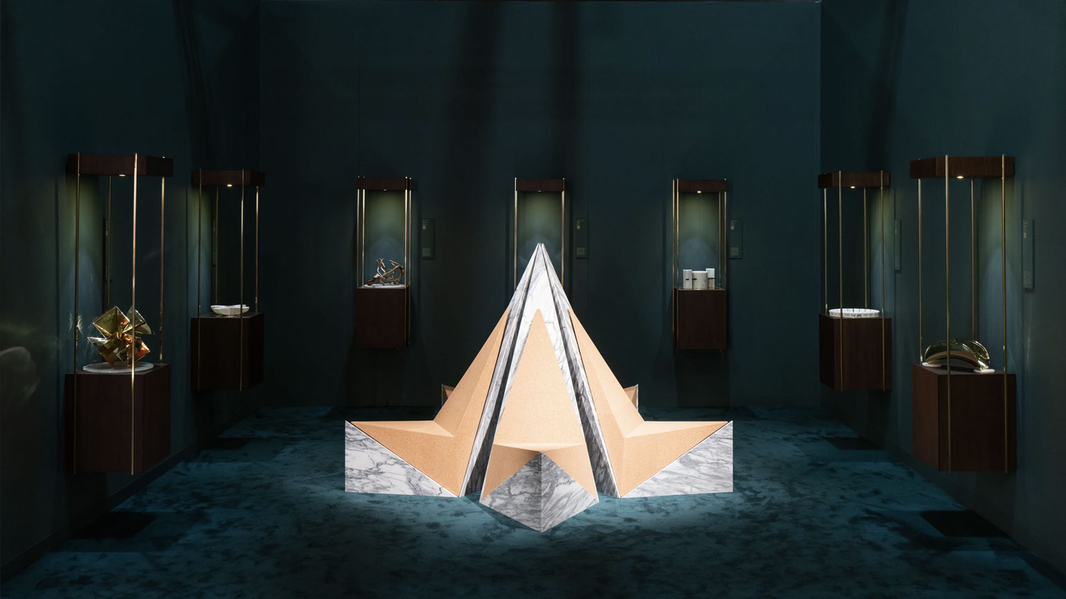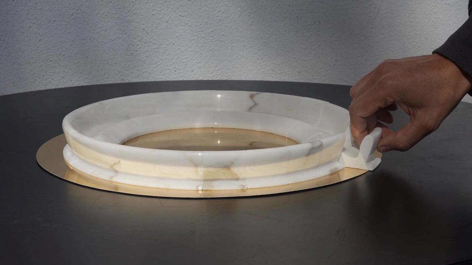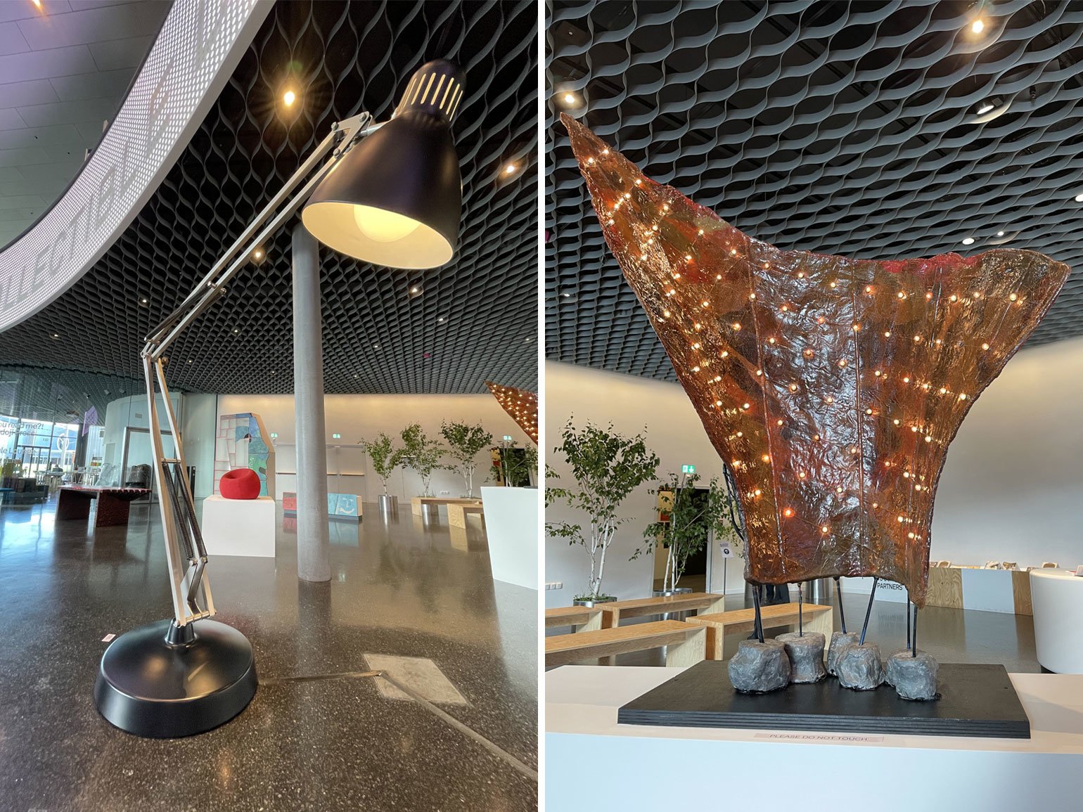 Трудоёмкий процесс работы поэтапно продемонстрировали на серии металлических шаров. Вокруг них располагались современные по форме предметы интерьера из чёрного матового металла с тонким геометрическим серебряным или золотым декором: например, журнальный столик «Капля» с оптическим рисунком из кругов, расходящихся по воде, большая настенная лампа «Горизонт».