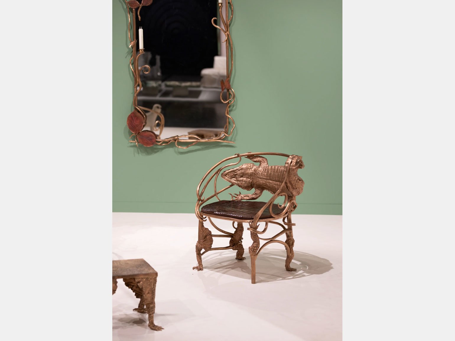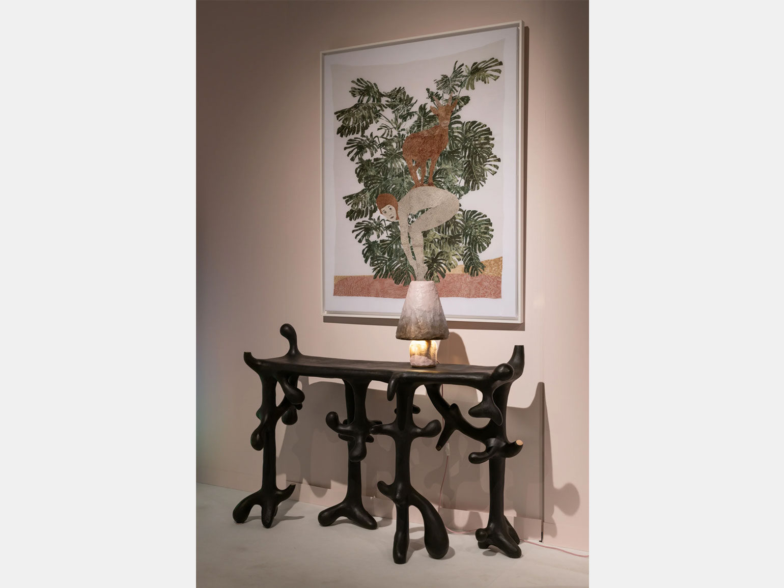 Ещё примеры: выполненное в виде гротескного профиля зеркало «Портрет» (Portrait Mirror) испанского дизайнера Хайме Хайон (галерея Kreo), чёрная консоль Rizoma (2024) с изгибами, напоминающими растущие корни дизайнера Абель Каркамо (галерея Scene Ouverte).