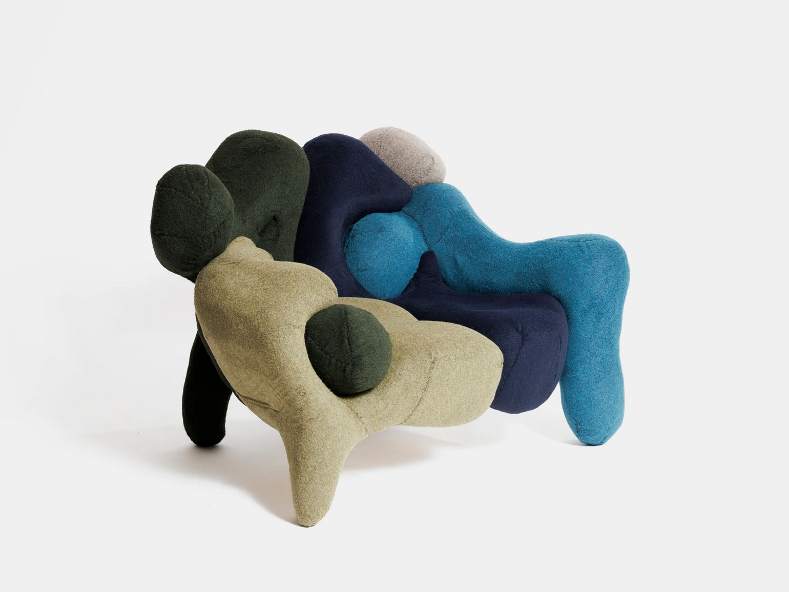 В центре стенда находился полномасштабный объект «Монумент коллективной цели (или предназначению)» (Monument To Collective Purpose, 2023). Он состоит из пяти одинаковых треугольных сидений с высокими треугольными спинками, плотно приставленными друг к другу. Получается, что каждый из сидящих смотрит в свою сторону, одновременно оставаясь частью группы. Так подчёркивается равноценная значимость разных точек зрения и важность объединения людей, обогащающих общее дело своим опытом.