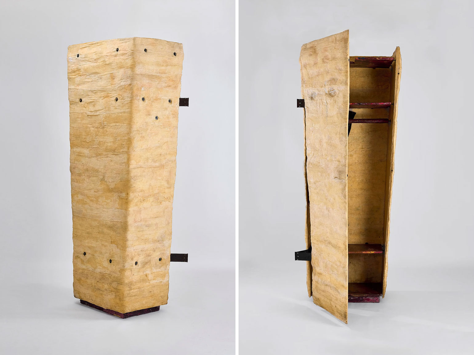 Он выполнен вручную из дерева, металла, хлопчатобумажной марли и смолы. На фронтальной панели расположены два влажных от смолы углубления — «глаза», — делающих шкаф похожим одновременно на мумию и саркофаг. Дверь закреплена с помощью металлического противовеса, который при каждом открытии издаёт зловещие звуки. Этот неожиданный драматический эффект представители галереи охотно демонстрировали посетителям.