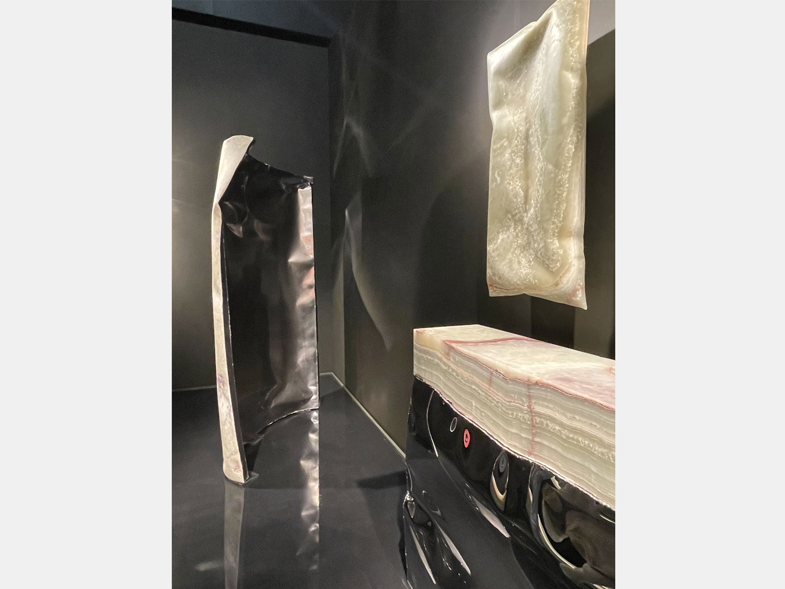 В центре фокуса внимания сразу нескольких галерей — неожиданные сочетания материалов и их обработка с помощью современных технологий. Брюссельская галерея Objects with Narratives представила персональную выставку новой коллекции бельгийского дизайнера Бена Стормса. Она создана из зелёного оникса, литого стекла и алюминия.