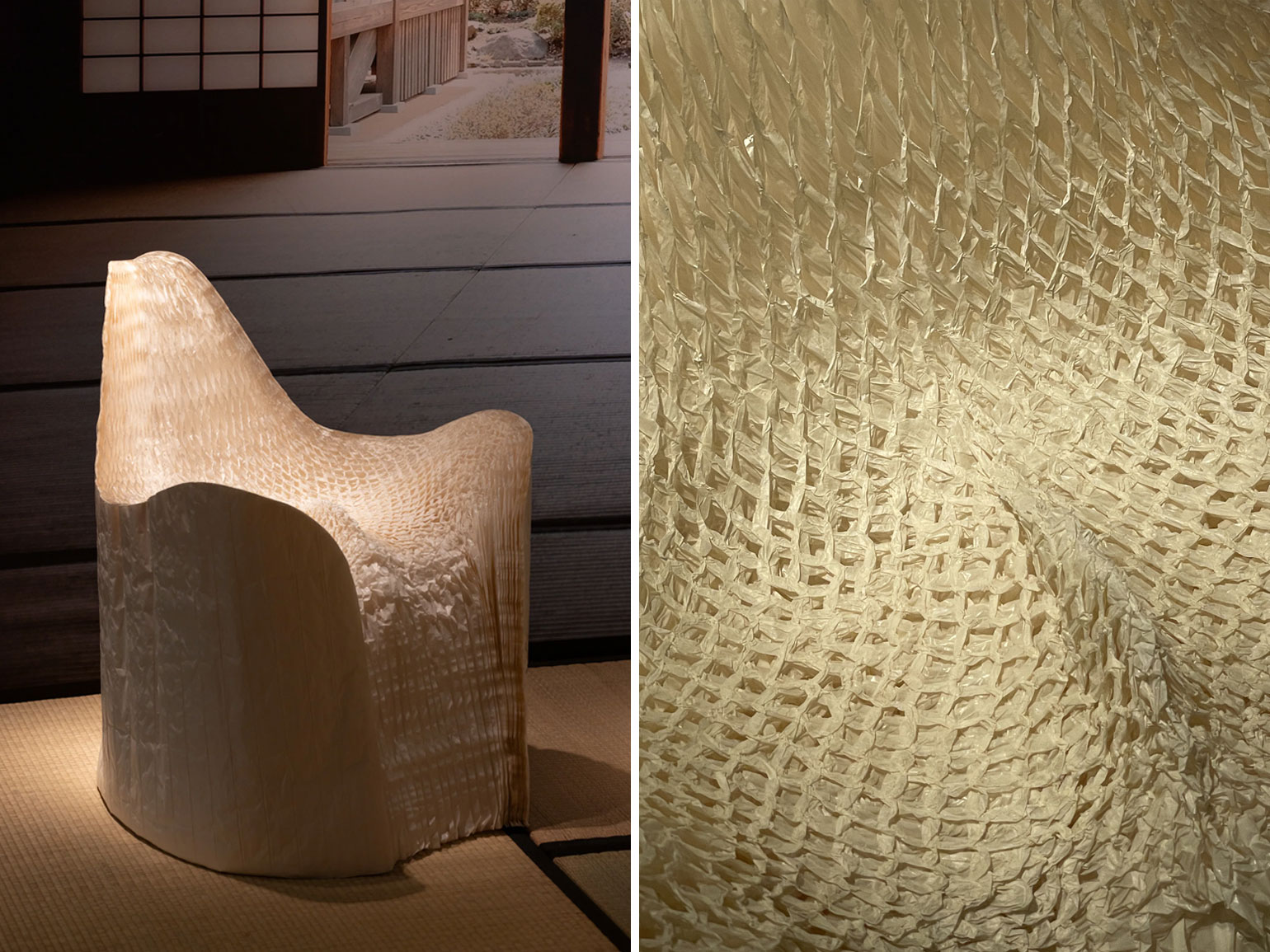 В частности, они показали знаменитое кресло из «бумажных сот» (Honey Pop Armchair, 2001) японского дизайнера и художника Токудзина Йосиоки. Кресло сделано из тонкой полупрозрачной белой бумаги, сложенной гармошкой. Окончательный изгиб сиденья формируется после того, как дизайнер присядет на своё творение и немного примнёт бумагу.