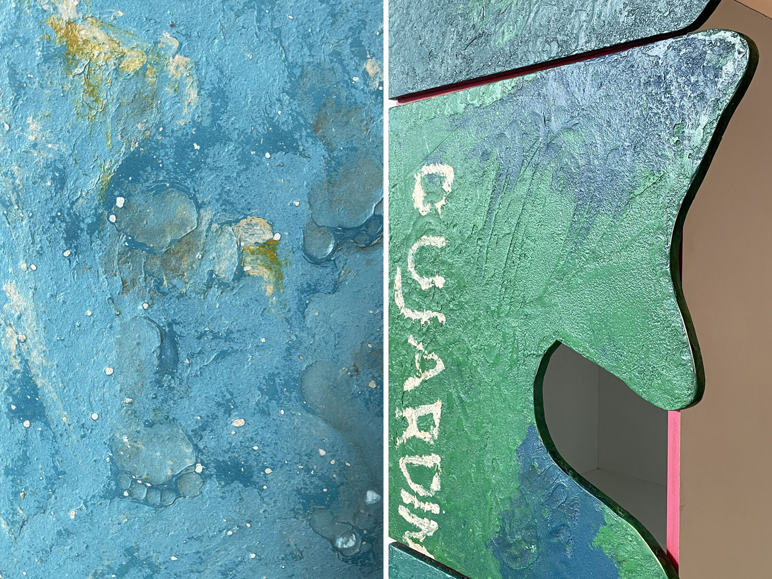 В своих работах автор часто обращается к исследованию вопросов культурной идентичности и исторической памяти — через эксперименты с материалами. В частности, эта скамья состоит из плиты чёрного африканского гранита с грубым необработанным краем и выгравированным цифровым кодом, армированного стекловолокном бетона, обожжённой плиты ОСП, обожжённой медово-молочной патины, окрашенной в красный цвет стали и полиуретана. Итоговый образ — отсылка к эстетике архитектуры брутализма и детским воспоминаниями автора о дворовых играх.