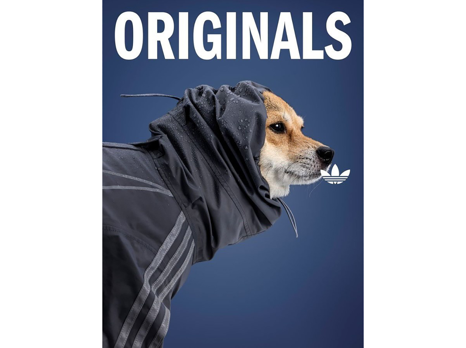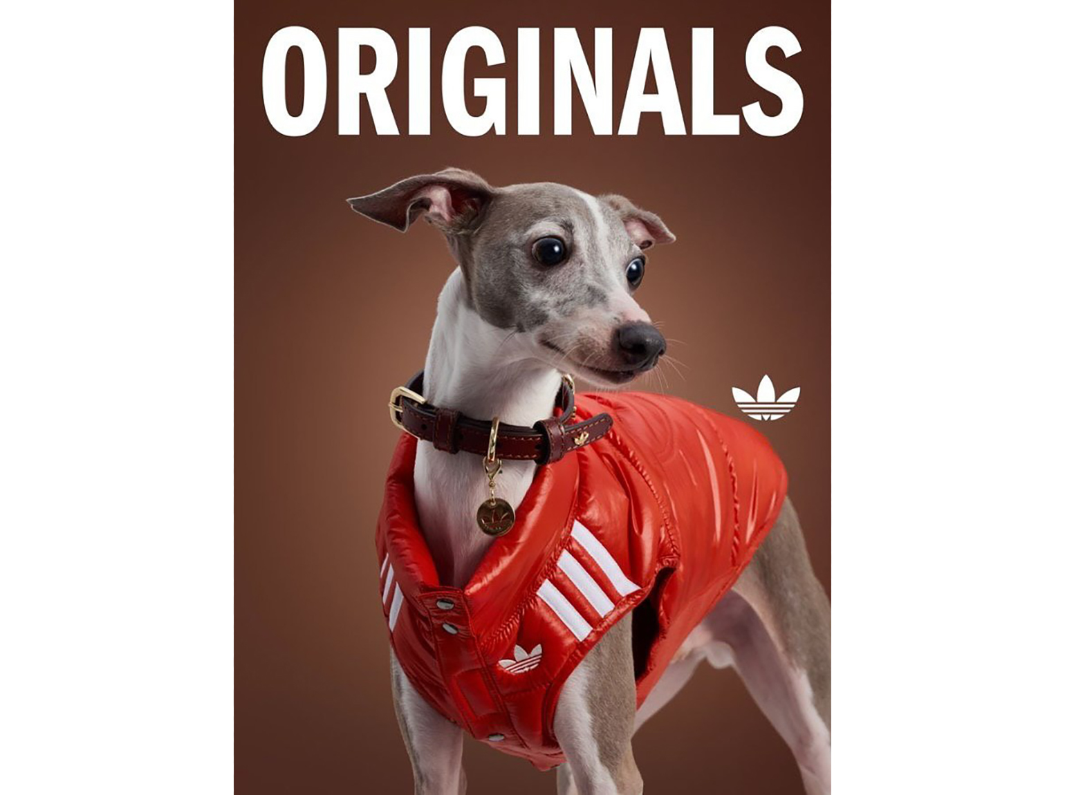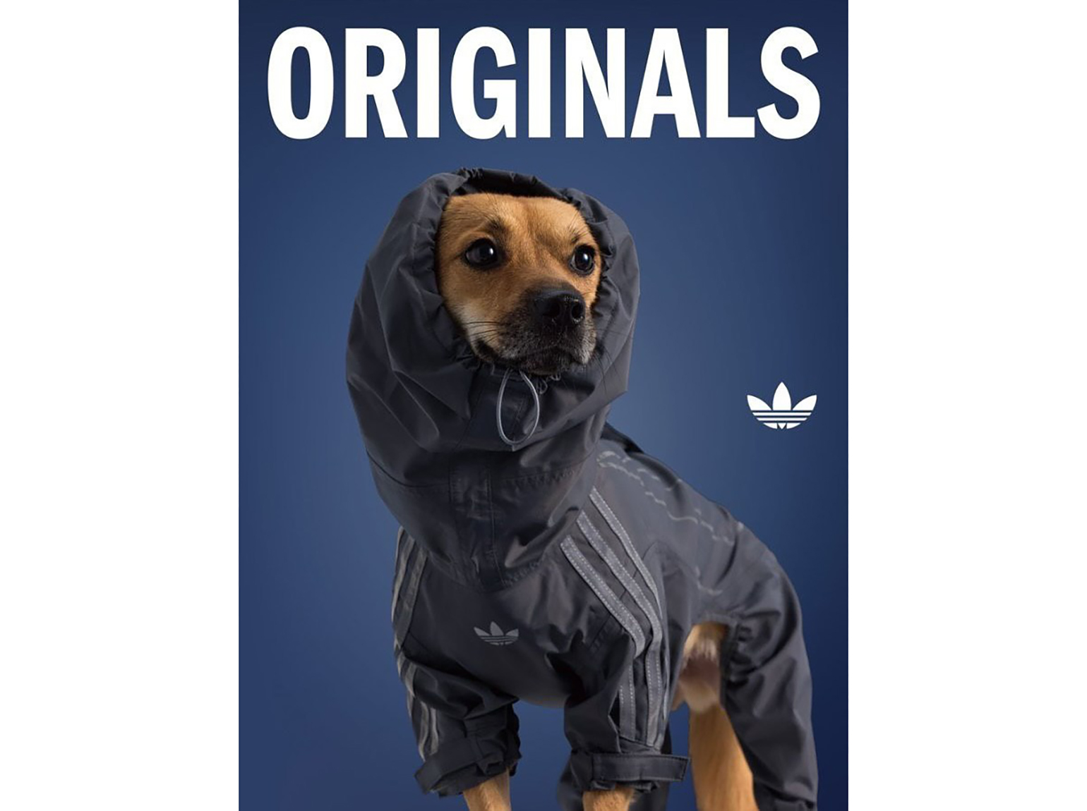В коллекцию для домашних животных вошли ветровки, жилеты и спортивные костюмы с классическими элементами дизайна — тремя полосками и логотипом Trefoil.