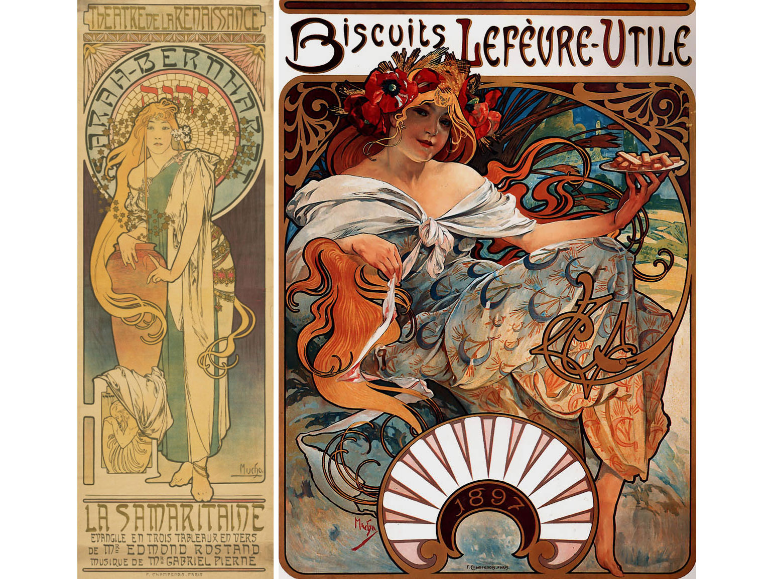 Плакат «Жисмонда» (1894), серия декоративных панно «Времена года» (1896), рекламные плакаты для JOB, Moët & Chandon, «Славянская эпопея» (1910–1928) — монументальный цикл из двадцати полотен.