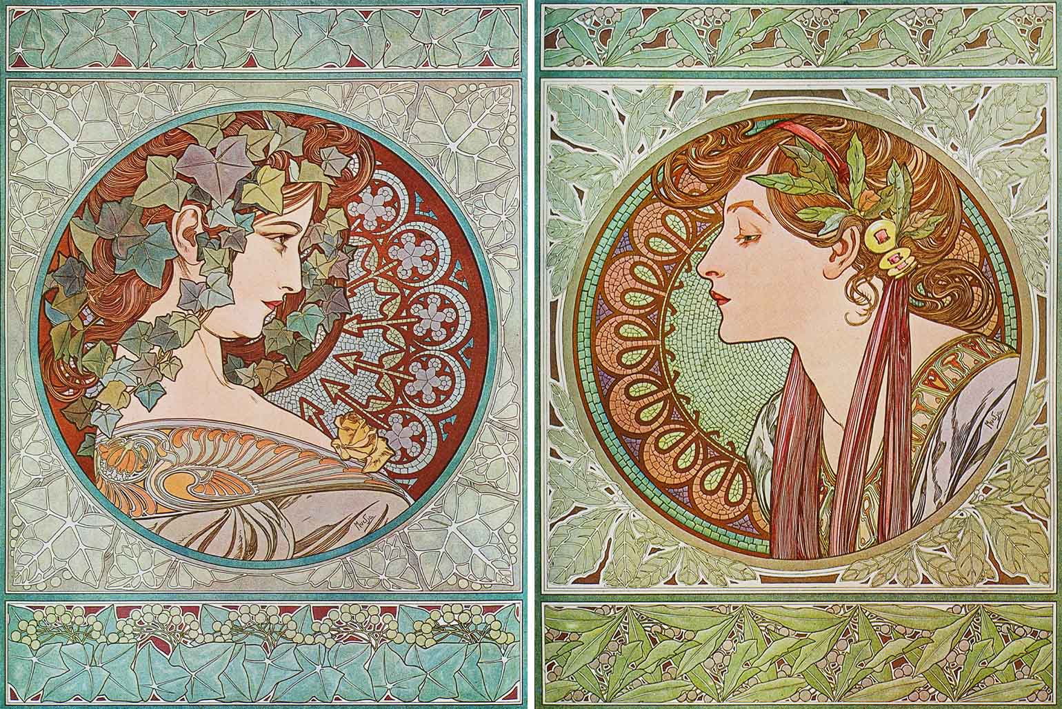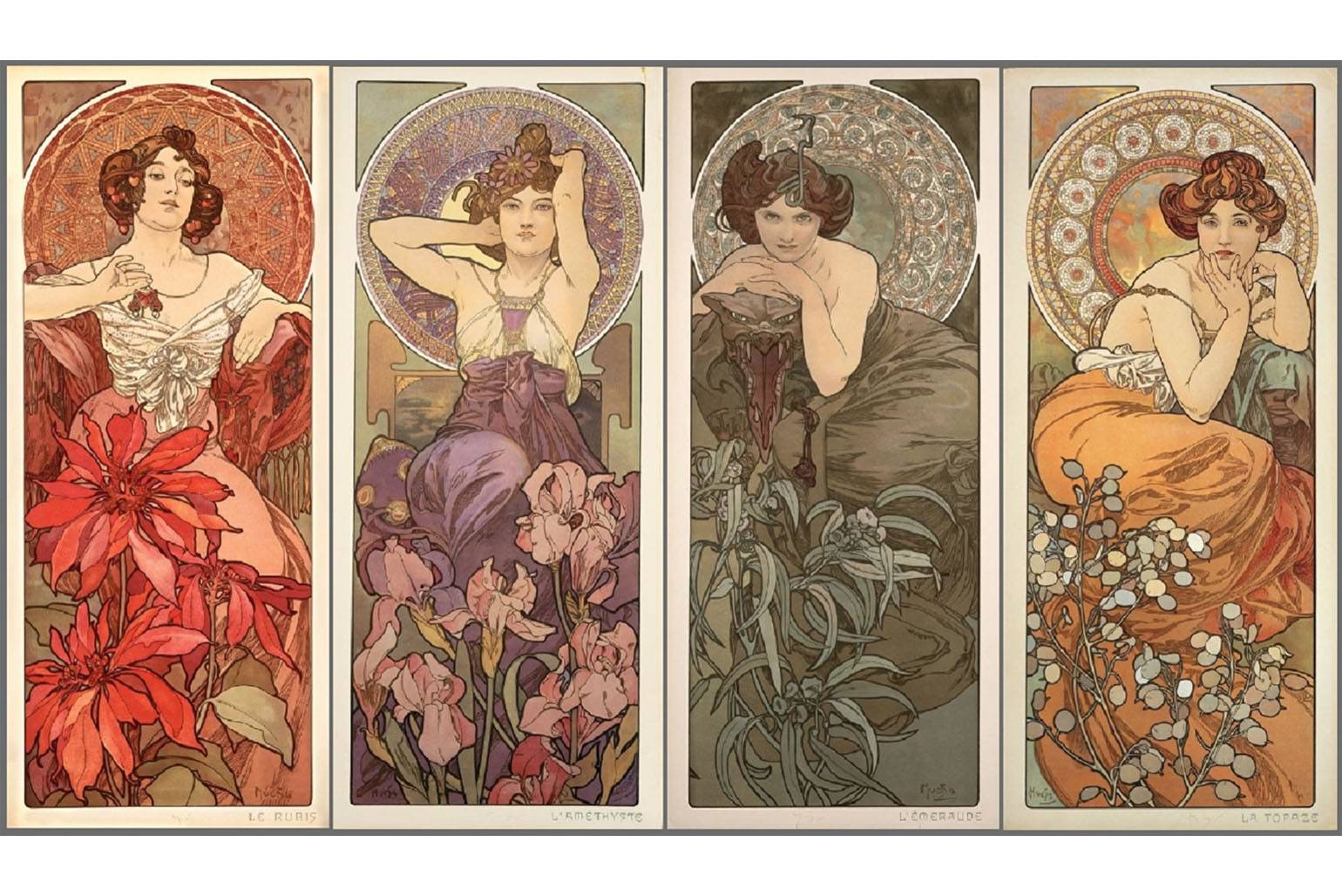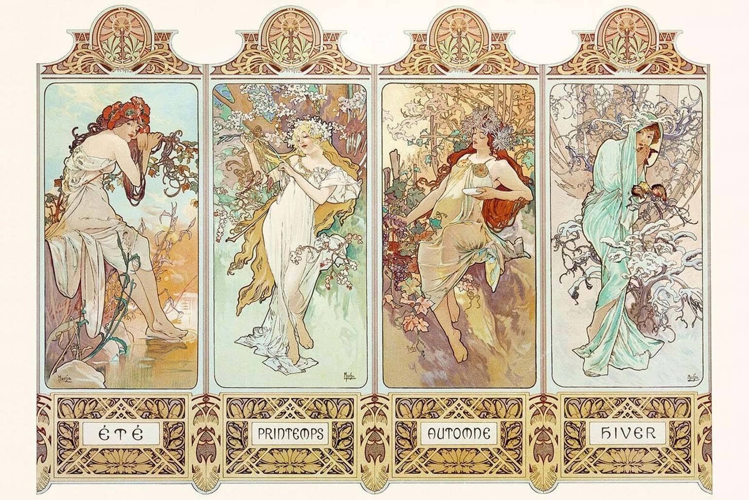 Декоративные панно. Серия «Времена года» (1896) стала одной из самых известных работ Мухи. Четыре женские фигуры, каждая в своём природном окружении, передают настроение сезона. Популярность серии была настолько высокой, что её переиздавали несколько раз.