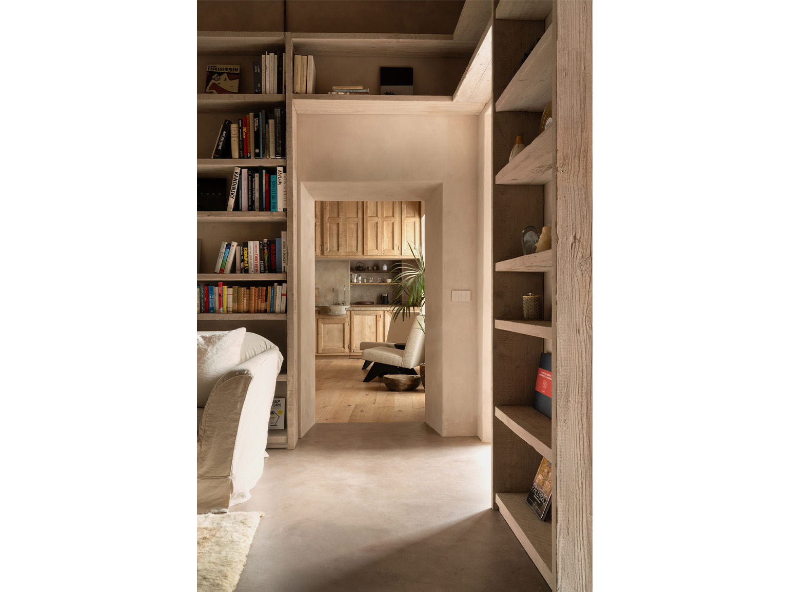 По словам Миньятти, задачей было создать «тихий баланс между временем и современностью», сохранив атмосферу творческого пространства. Архитектор работала с существующей структурой — деревянными потолочными балками, паркетом и сводчатыми нишами, — дополняя их тактильными натуральными материалами.