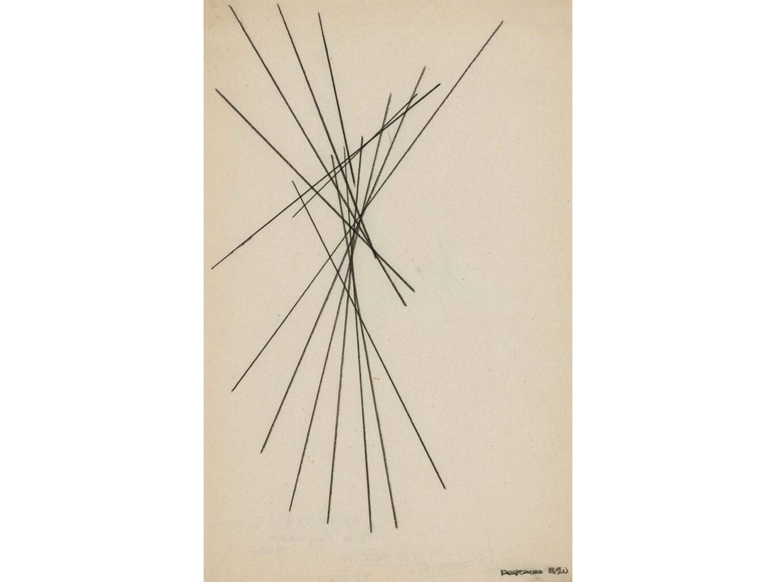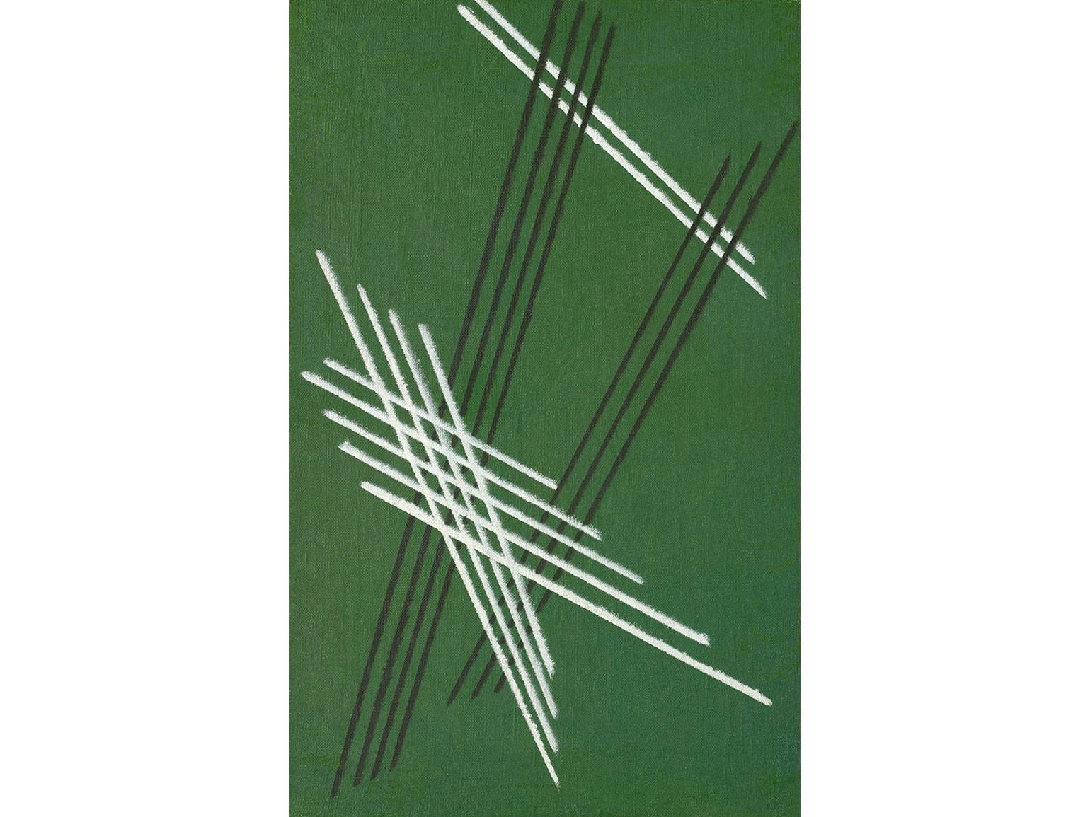 На картине «Линии на зелёном фоне» сочетание штрихов будто образует пересекающиеся плоскости, что создаёт визуальное напряжение: