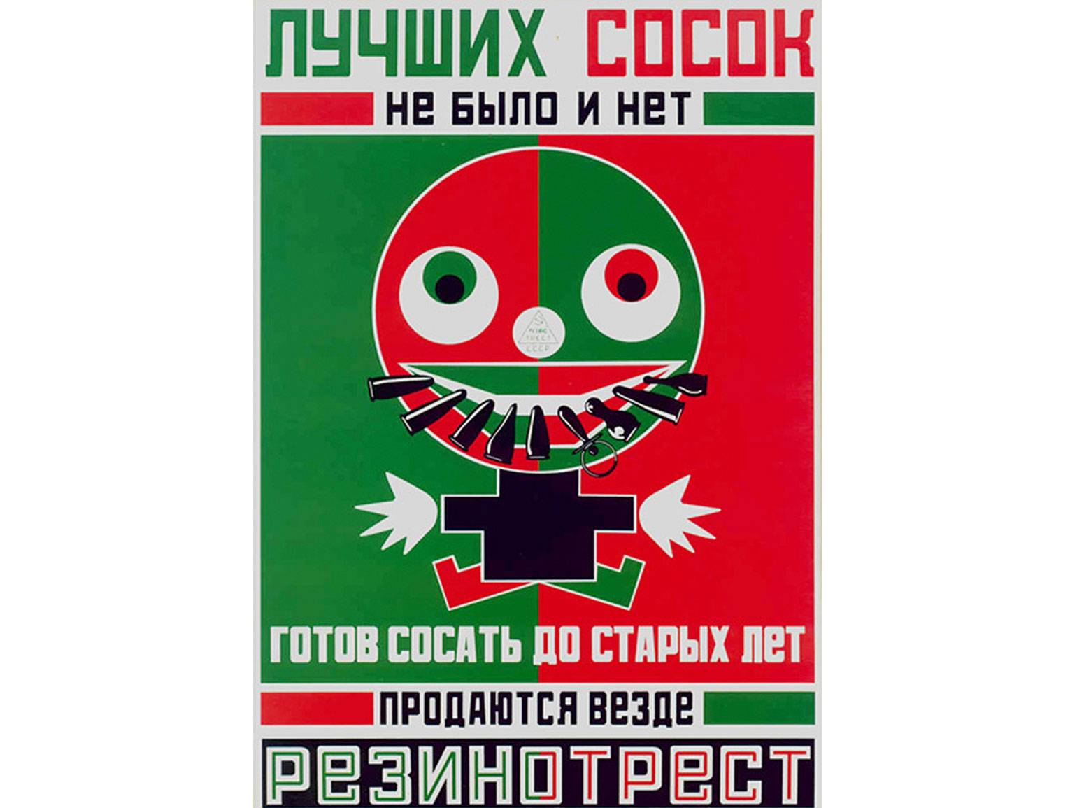 В плакате для сосок «Резинотреста» Родченко применил зеркальную симметрию и чётко разделил элементы изображения контрастными цветами, что усилило впечатление от провокационного слогана.