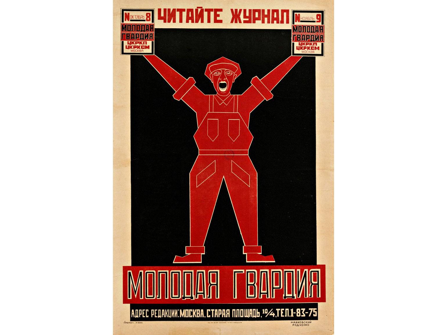 Плакат для рекламы общественно-политического журнала выполнен в упрощённом геометрическом стиле. Красный и чёрный цвета в сочетании с фигурой кричащего мужчины привлекают внимание, создают ощущение срочности и важности.