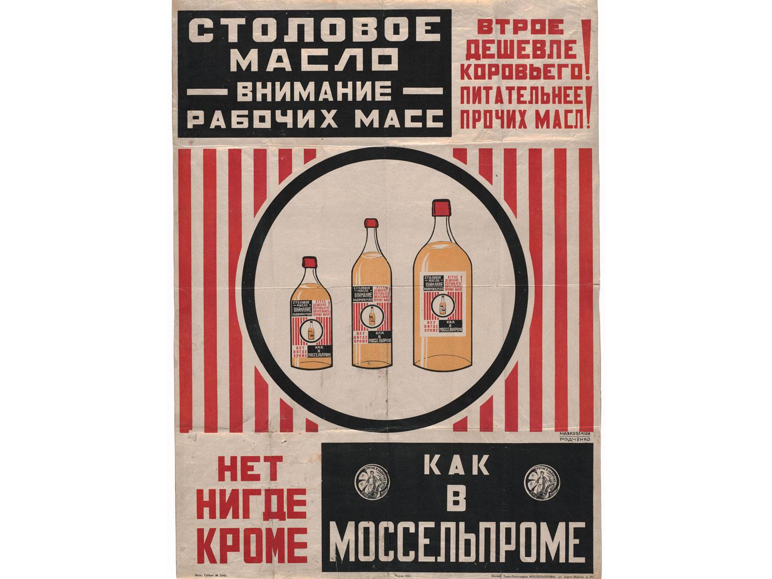 Плакат для рекламы масла отражает эстетику конструктивизма: контрастные цвета, простая геометрия и чёткая композиция сразу обращают внимание зрителя на рекламируемый продукт. Сочетание красного и чёрного выглядит броско, при этом не роскошно. Цветовая пара подчёркивает, что продукт доступен для широких слоёв.
