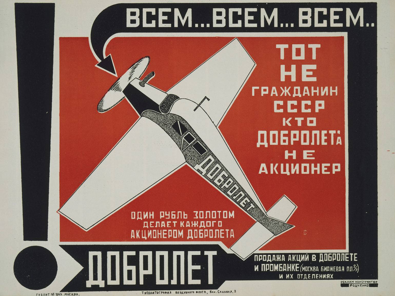 Александр Родченко работал над коммуникационными материалами для агитационно-рекламных кампаний в поддержку общества Добровольного воздушного флота «Добролёт».
