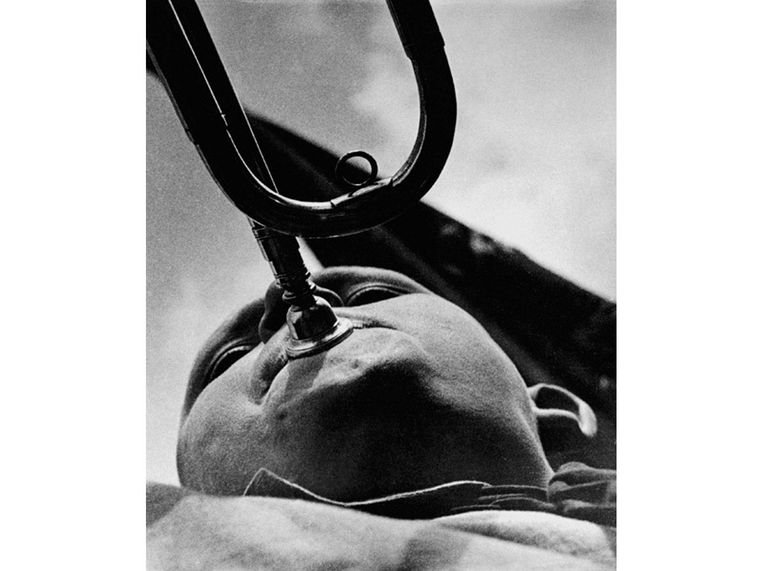 Фотография «Пионер-трубач» выполнена с ракурса «снизу вверх», что акцентирует внимание на исполнителе и инструменте. Трубач запечатлён в момент игры — свойственная этому действию динамика передана с помощью асимметрии.