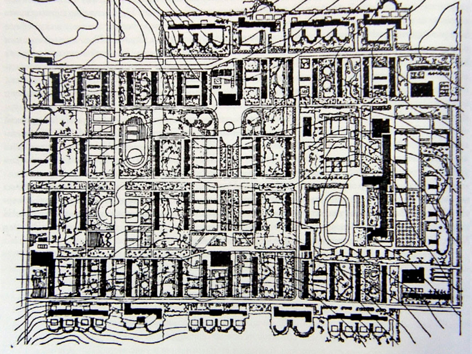 Предназначение: отдельные девятиэтажные и соединённые арками пятиэтажные жилые дома с цепью одноэтажных магазинов и других объектов инфраструктуры