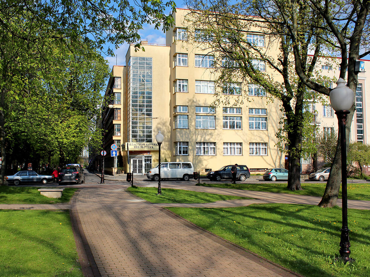Архитектор: Наум Трахтенберг. Он не имел отношения к школе в Дессау, но здание было вписано в архитектурный ансамбль шестигранной площади и стиль баухаус