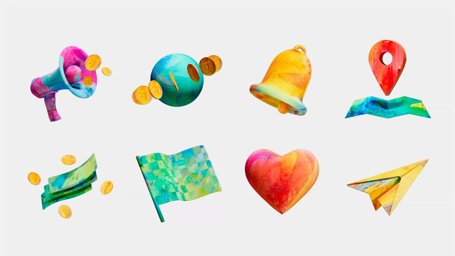 Очень нравится наблюдать за этим трендом. В марте 2023 года вышел ребрендинг платёжной системы Wise от лондонской студии Ragged Edge. Отдельного внимания в кейсе заслуживают объёмные иллюстрации — посмотрите, как «денежная текстура» преображает стандартные формы иконок, делает их уникальными и раскрывает метафору «все деньги мира».