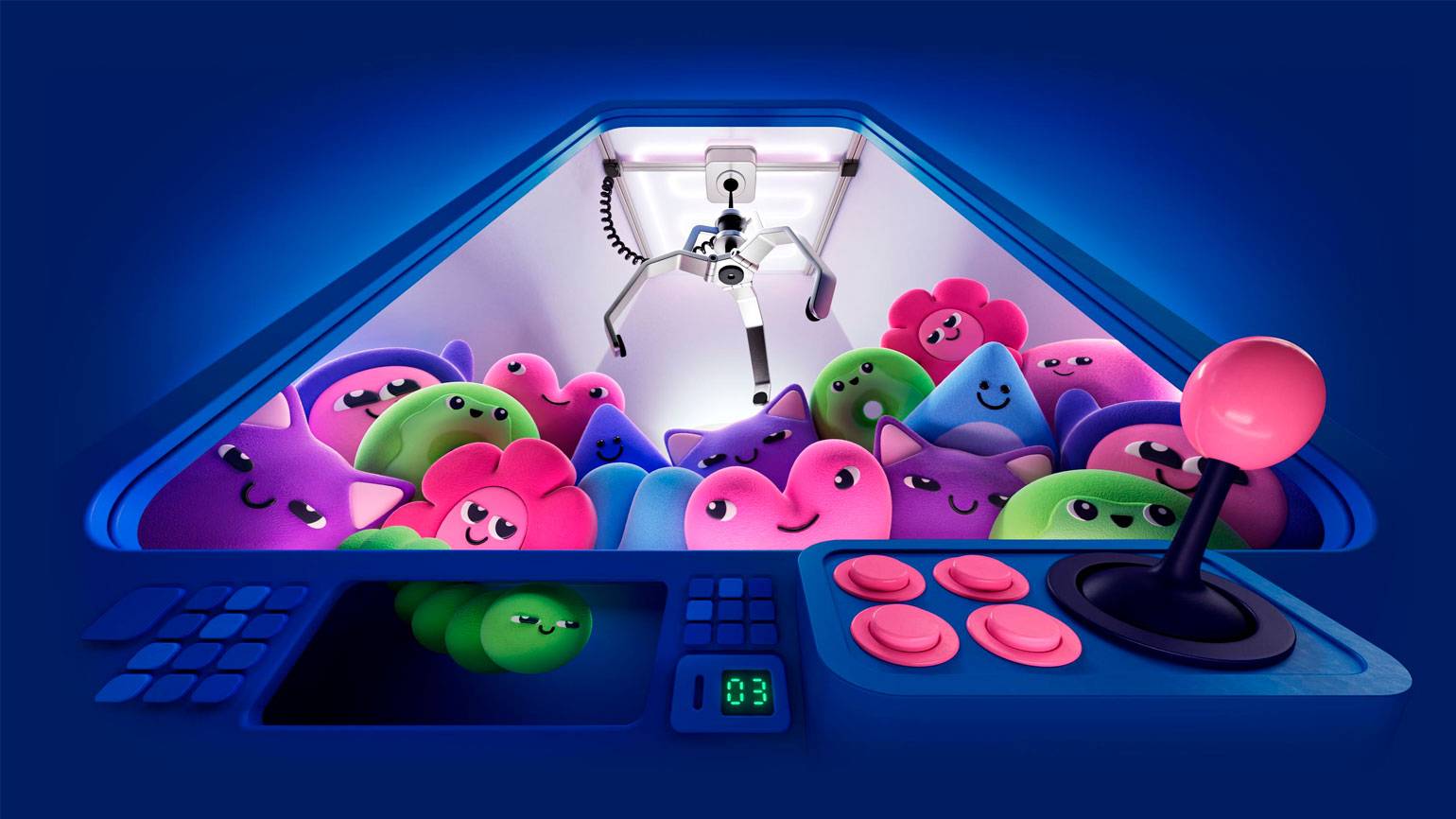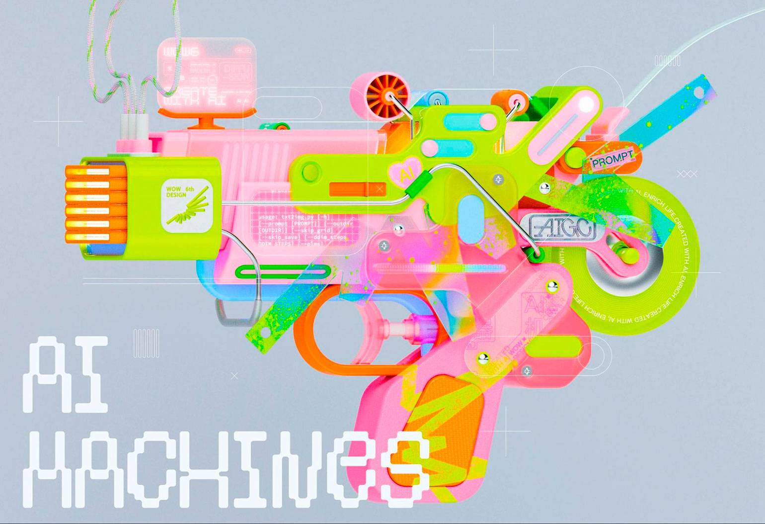 А вот пример на стыке ностальгии и будущего, разума и воображения. Причудливые 3D-объекты разработаны на тему «Искусственные машины» и состоят из смешения различных элементов и кнопочек. Они одновременно отсылают и к ретроэстетике, и к футуризму. Всё это подано в игривой манере и передаёт позитивное настроение.