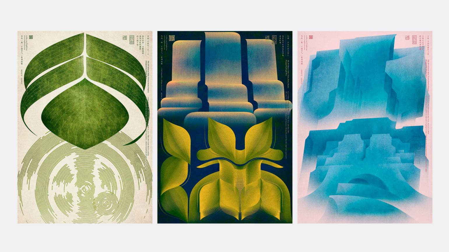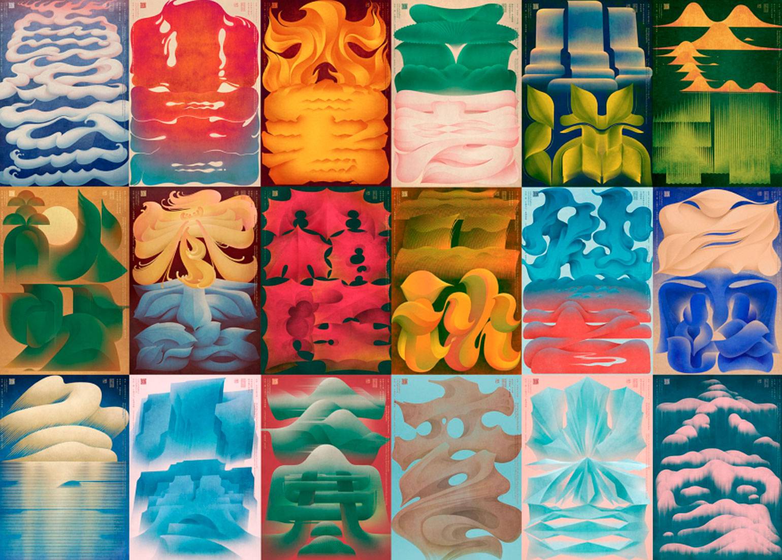 Другой пример — The 24 Chinese Solar Terms Poster Series. Это проект из 24 типографических постеров, которые отражают 24 солнечных периода традиционного китайского календаря. Каждый плакат состоит из двух графических символов, вдохновлённых стилем традиционной китайской живописи тушью и каллиграфии кистью.