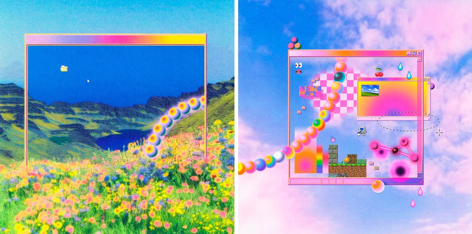 Или иллюстратор Víctor Arce из Барселоны, который создаёт цифровые коллажи. Он ностальгирует по веб-дизайну 1990-х и, соединяя курсоры и окна браузера с сюрреалистическими пейзажами, переносит нас в яркий RGB-мир.
