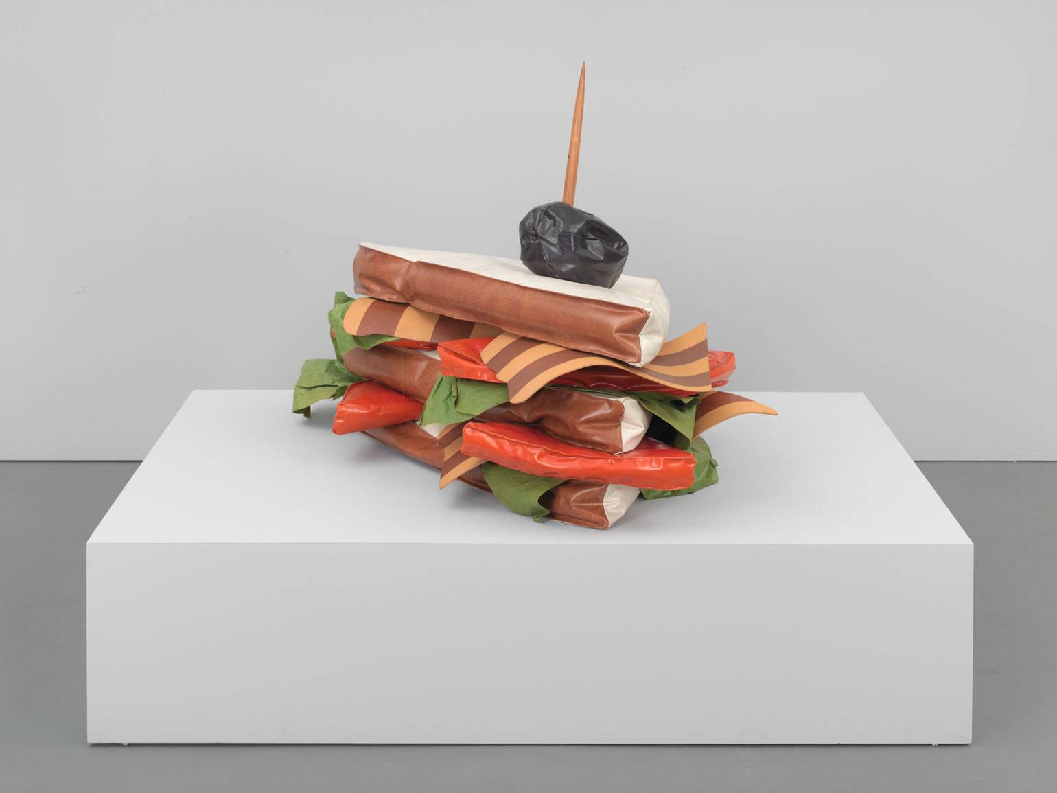 А ещё он делал в это время «Хэппенинги». Сначала он шил мягкие холщовые скульптуры, а потом пришёл к винилу. Это промышленный материал, которым часто обивали мебель в послевоенной Америке, не твердый и не мягкий. А если набить сшитую из него скульптуру мягкими волокнами, то со временем она провиснет под воздействием гравитации. Так он сделал Giant BLT (Bacon, Lettuce, and Tomato Sandwich) — «Гигантский бутерброд с беконом, салатом и помидором» и Soft Toilet («Мягкий унитаз»).