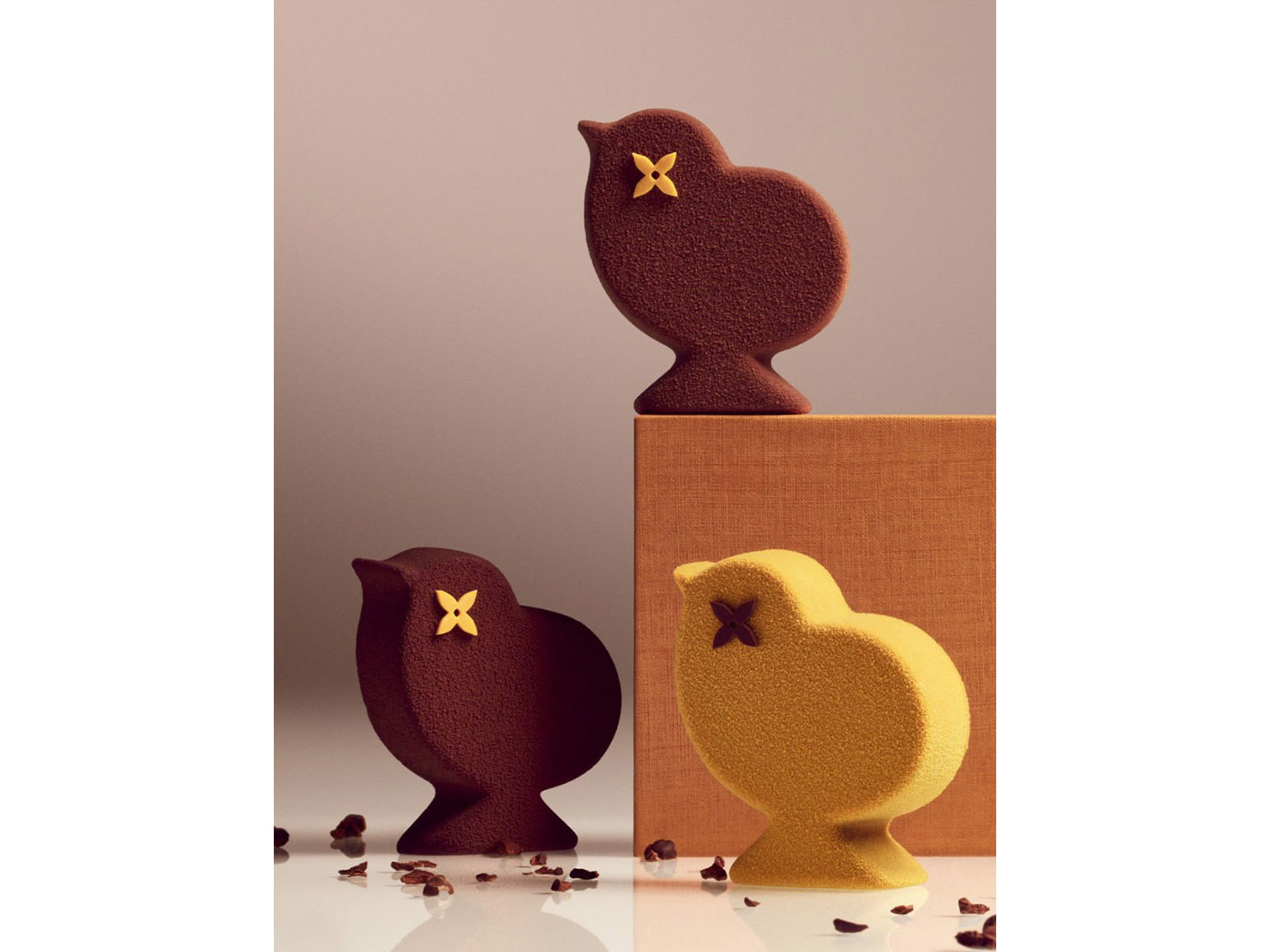 Помимо неё, в коллекцию вошли Chocolate Chicks — фигурки цыплят из тёмного шоколада с начинкой из пралине на основе гречихи и карамели. Вкус и текстуры построены на контрасте: насыщенный шоколад сочетается с ореховой глубиной и мягкой сладостью карамели. Ещё в коллекции есть набор шоколадных яиц.